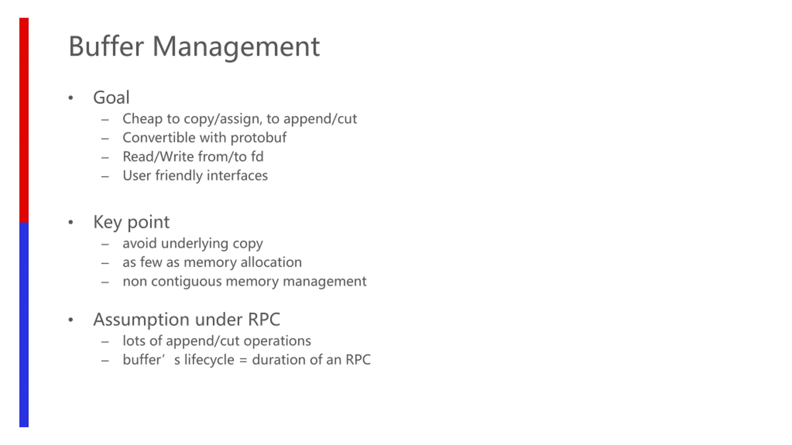 Buffer Management Goal Cheap to copy/assign, to append/cut Convertible with protobuf Read/Write from/to fd User friendly interfaces Key point avoid underlying copy as few as memory allocation non contiguous memory management Assumption under RPC lots of append/cut operations buffer s lifecycle = duration of an RPC