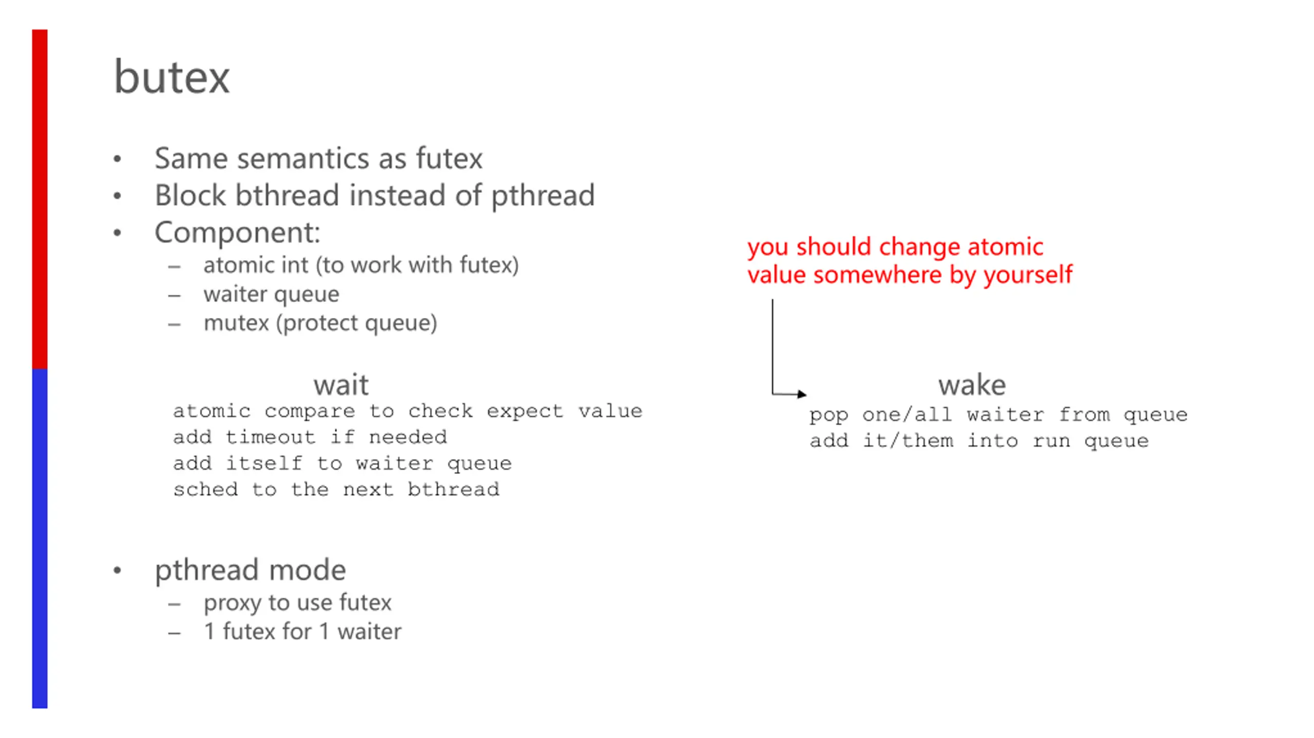 butex Same semantics as futex Block bthread instead of pthread Component: atomic int (to work with futex) waiter queue mutex (protect queue) you should change atomic value somewhere by yourself wait wake atomic compare to check expect value add timeout if needed add itself to waiter queue sched to the next bthread pop one/all waiter from queue add it/them into run queue pthread mode proxy to use futex 1 futex for 1 waiter