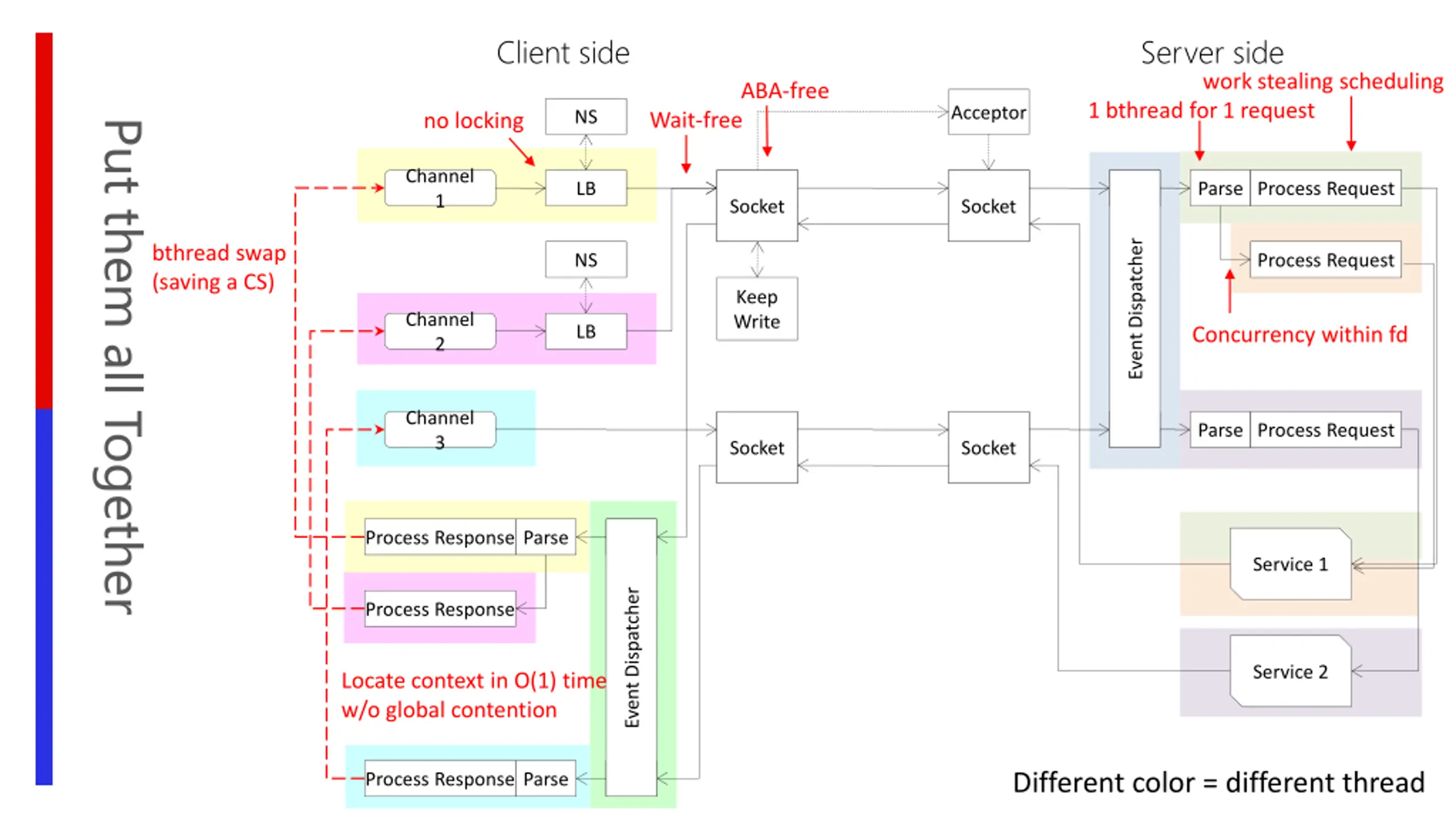 Client side Server side work stealing scheduling ABA-free 1 bthread for 1 request Acceptor NS Wait-free no locking Put them all Together Channel 1 LB Parse Process Request Socket Socket Event Dispatcher bthread swap (saving a CS) NS Process Request Keep Write Channel 2 LB Concurrency within fd Channel 3 Parse Process Request Socket Socket Process Response Parse Service 1 Event Dispatcher Process Response Service 2 Locate context in O(1) time w/o global contention Different color = different thread Process Response Parse