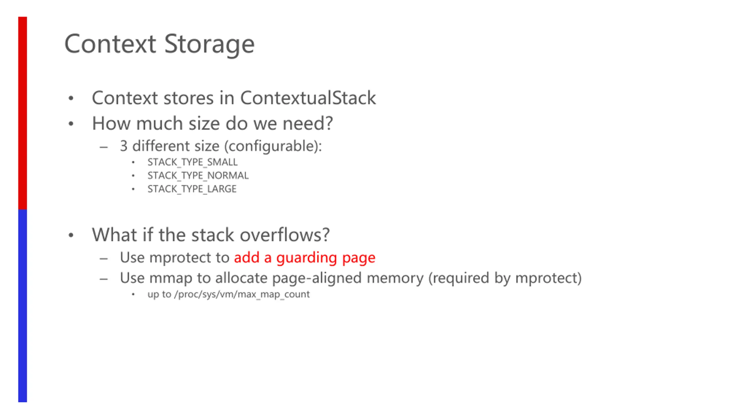 Context Storage Context stores in ContextualStack How much size do we need? 3 different size (configurable): STACK_TYPE_SMALL STACK_TYPE_NORMAL STACK_TYPE_LARGE What if the stack overflows? Use mprotect to add a guarding page Use mmap to allocate page-aligned memory (required by mprotect) up to /proc/sys/vm/max_map_count