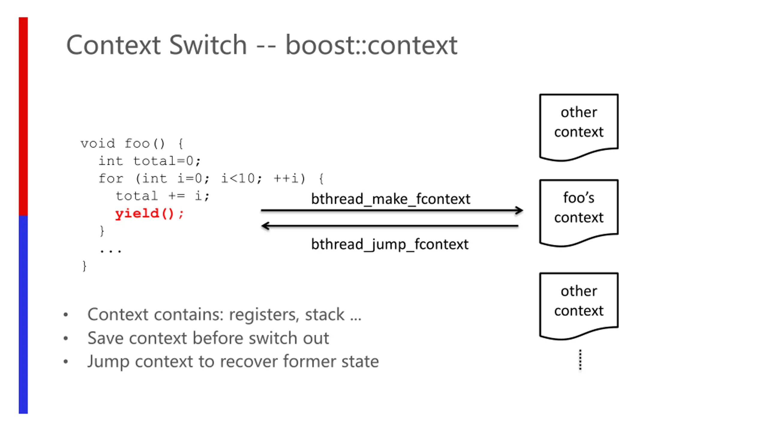 Context Switch -- boost::context other context void foo() { int total=0; for (int i=0; i<10; ++i) { total += i; yield(); } ... } foo s context bthread_make_fcontext bthread_jump_fcontext other context Context contains: registers, stack ... Save context before switch out Jump context to recover former state