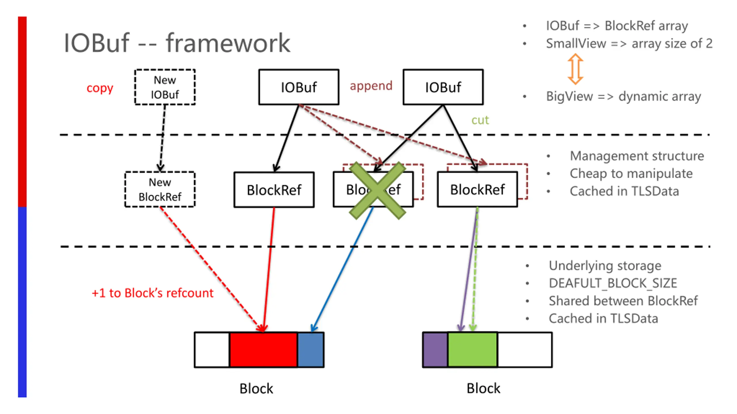 IOBuf => BlockRef array SmallView => array size of 2 IOBuf -- framework New IOBuf append IOBuf IOBuf copy BigView => dynamic array cut Management structure Cheap to manipulate Cached in TLSData BlockRef BlockRef BlockRef BlockRef New BlockRef BlockRef Underlying storage DEAFULT_BLOCK_SIZE Shared between BlockRef Cached in TLSData +1 to Block s refcount Block Block