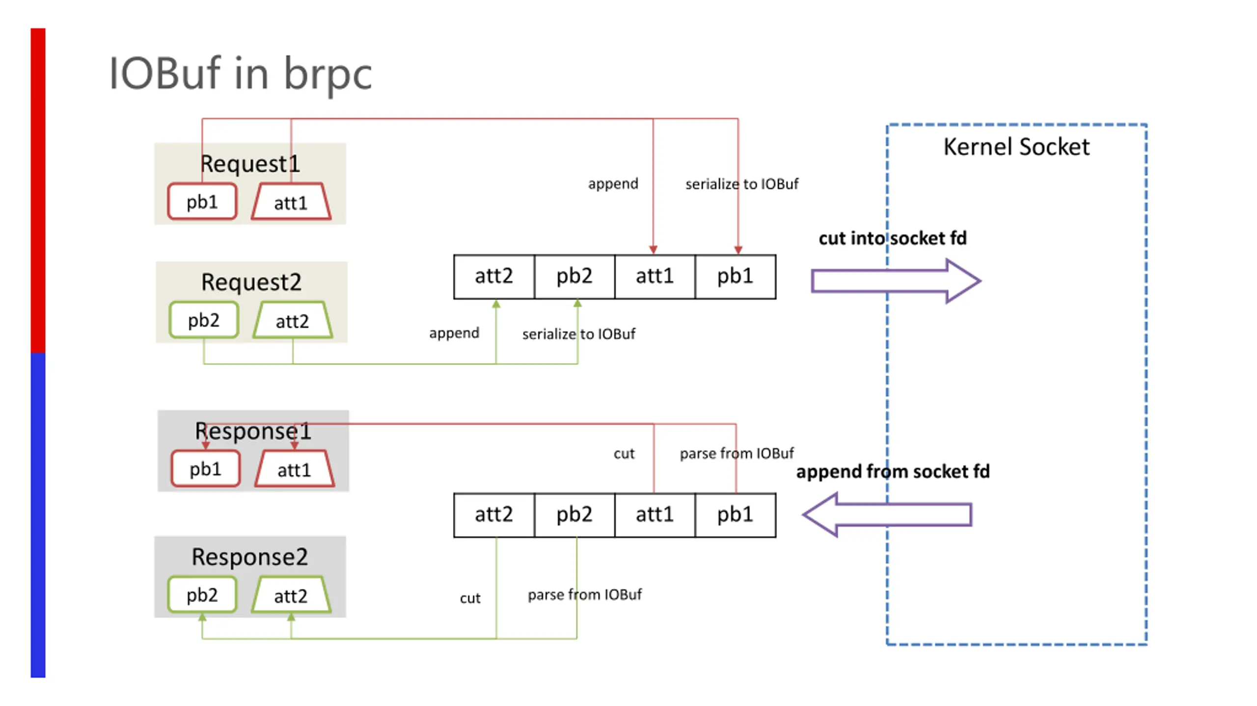 IOBuf in brpc Kernel Socket Request1 append serialize to IOBuf pb1 att1 cut into socket fd att2 pb2 att1 pb1 Request2 pb2 att2 append serialize to IOBuf Response1 parse from IOBuf cut pb1 att1 append from socket fd att2 pb2 att1 pb1 Response2 pb2 att2 parse from IOBuf cut