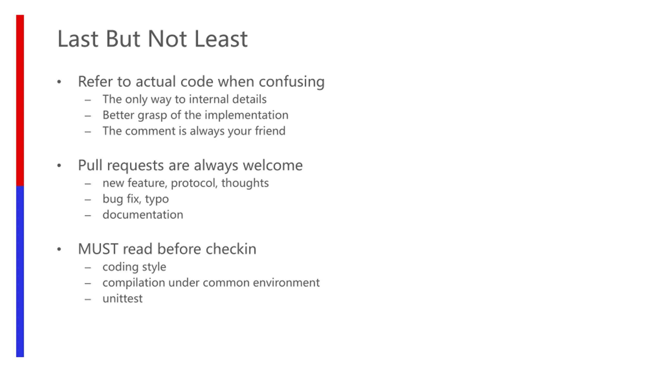 Last But Not Least Refer to actual code when confusing The only way to internal details Better grasp of the implementation The comment is always your friend Pull requests are always welcome new feature, protocol, thoughts bug fix, typo documentation MUST read before checkin coding style compilation under common environment unittest