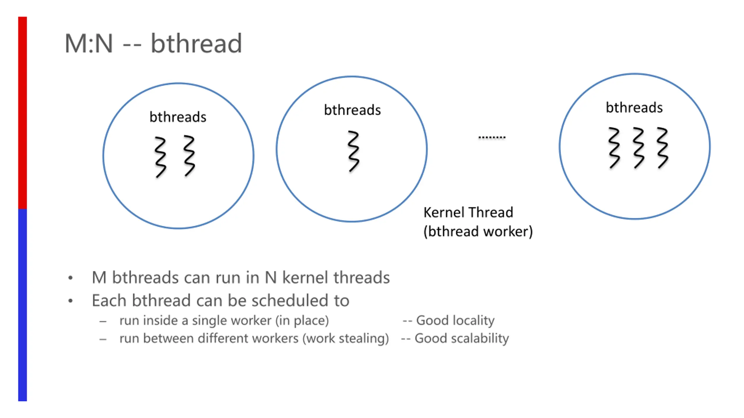 M:N -- bthread bthreads bthreads bthreads Kernel Thread (bthread worker) M bthreads can run in N kernel threads Each bthread can be scheduled to run inside a single worker (in place) -- Good locality run between different workers (work stealing) -- Good scalability