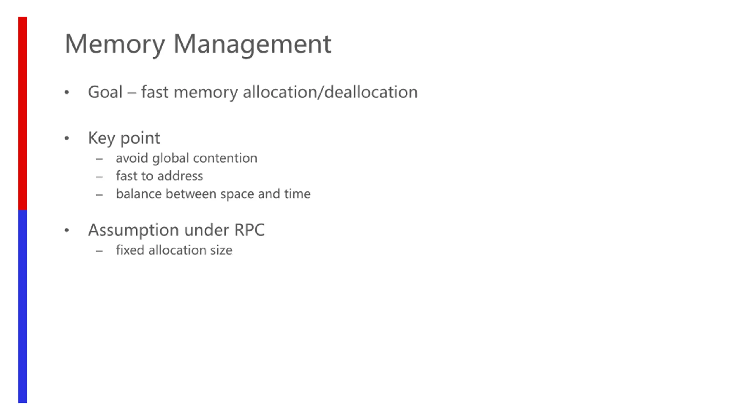 Memory Management Goal fast memory allocation/deallocation Key point avoid global contention fast to address balance between space and time Assumption under RPC fixed allocation size