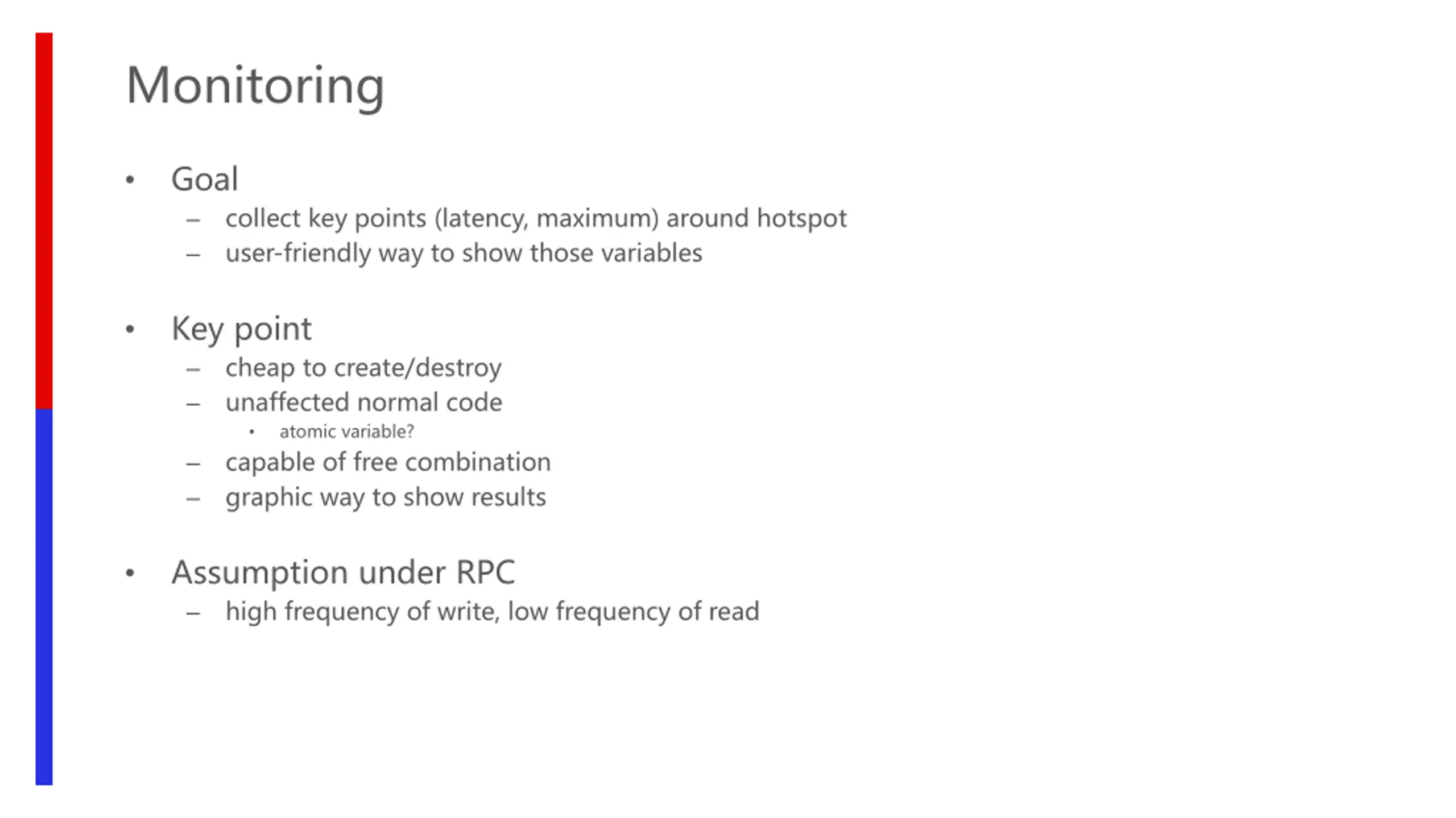Monitoring Goal collect key points (latency, maximum) around hotspot user-friendly way to show those variables Key point cheap to create/destroy unaffected normal code atomic variable? capable of free combination graphic way to show results Assumption under RPC high frequency of write, low frequency of read