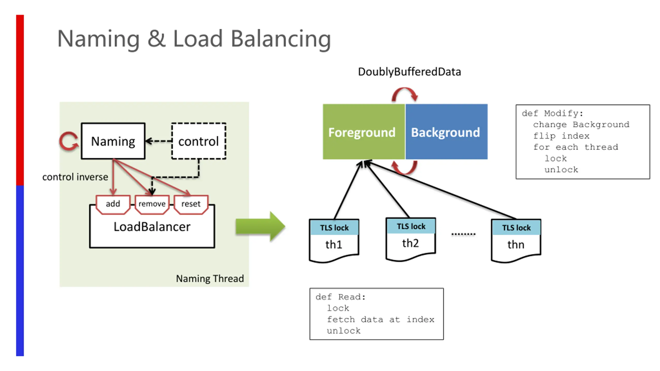 Naming & Load Balancing DoublyBufferedData def Modify: change Background flip index for each thread lock unlock Foreground Background Naming control control inverse add reset remove LoadBalancer TLS lock TLS lock TLS lock th2 th1 thn Naming Thread def Read: lock fetch data at index unlock