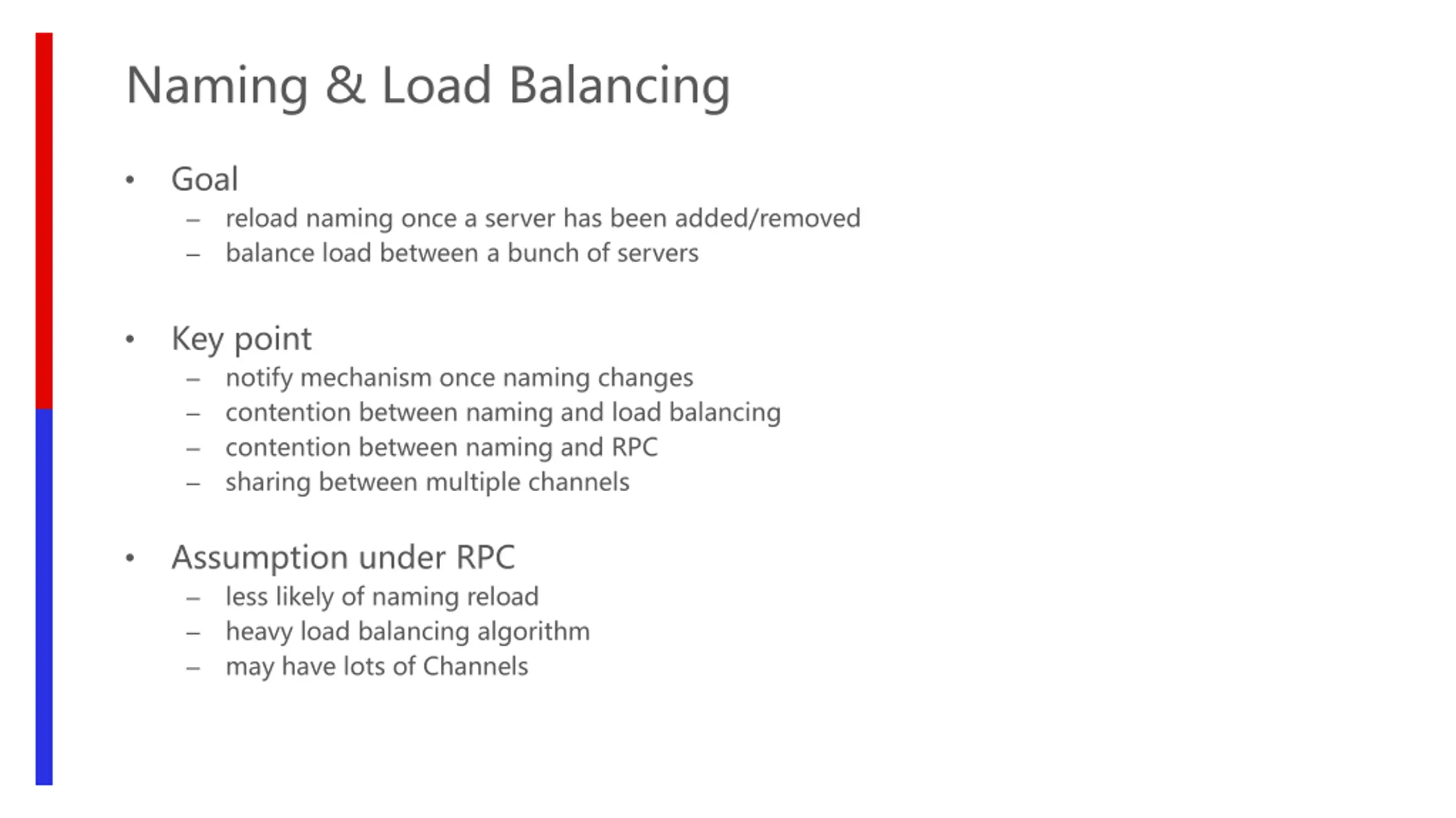 Naming & Load Balancing Goal reload naming once a server has been added/removed balance load between a bunch of servers Key point notify mechanism once naming changes contention between naming and load balancing contention between naming and RPC sharing between multiple channels Assumption under RPC less likely of naming reload heavy load balancing algorithm may have lots of Channels