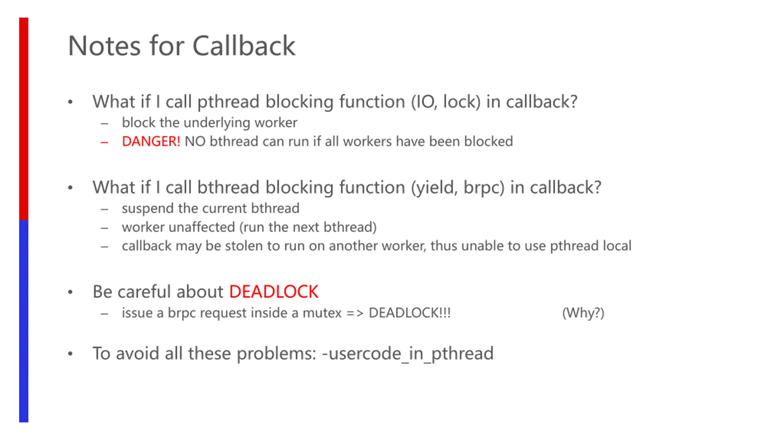 Notes for Callback What if I call pthread blocking function (IO, lock) in callback? block the underlying worker DANGER! NO bthread can run if all workers have been blocked What if I call bthread blocking function (yield, brpc) in callback? suspend the current bthread worker unaffected (run the next bthread) callback may be stolen to run on another worker, thus unable to use pthread local Be careful about DEADLOCK issue a brpc request inside a mutex => DEADLOCK!!! (Why?) To avoid all these problems: -usercode_in_pthread