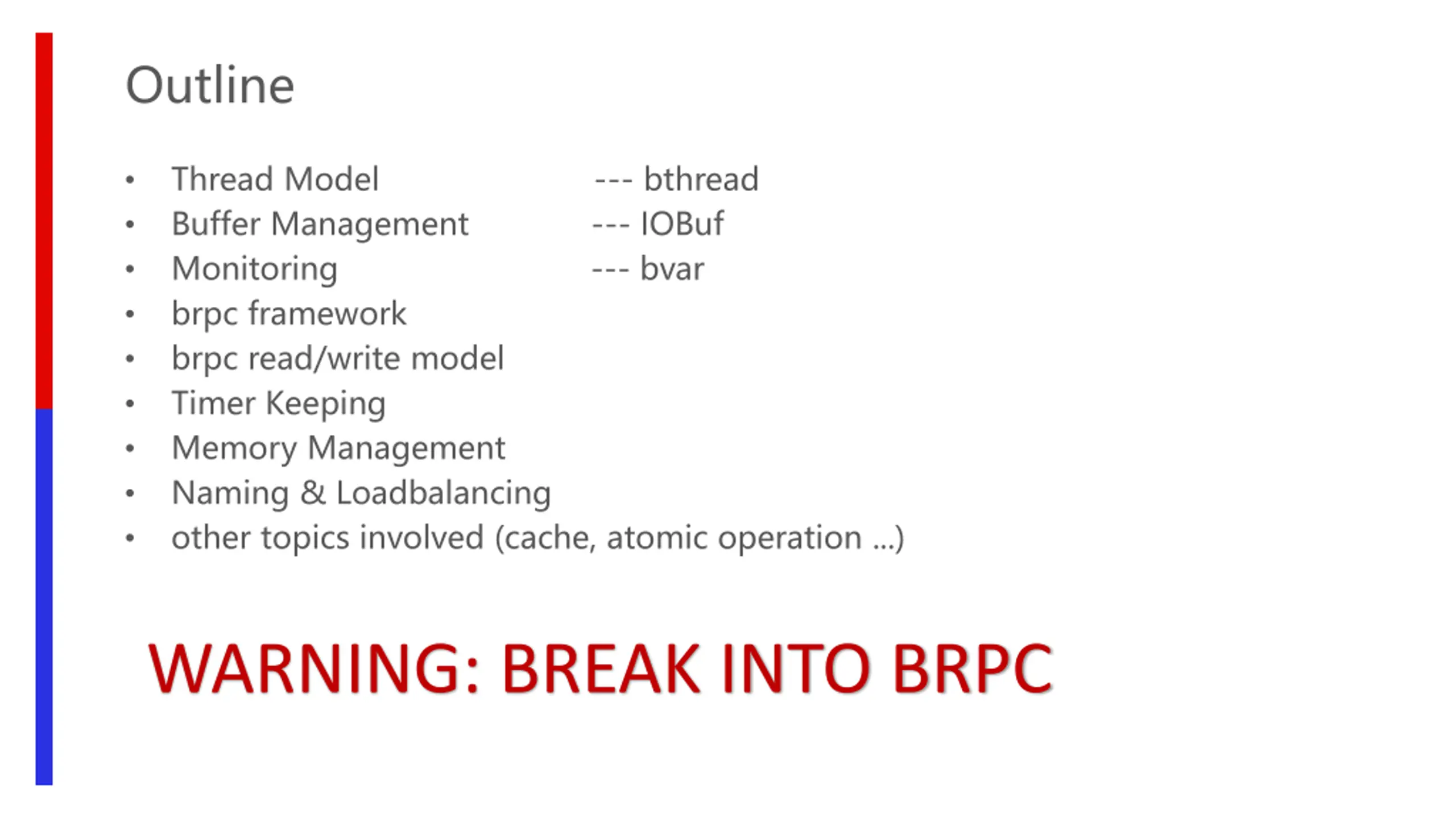 Outline Thread Model --- bthread Buffer Management --- IOBuf Monitoring --- bvar brpc framework brpc read/write model Timer Keeping Memory Management Naming & Loadbalancing other topics involved (cache, atomic operation ...) WARNING: BREAK INTO BRPC