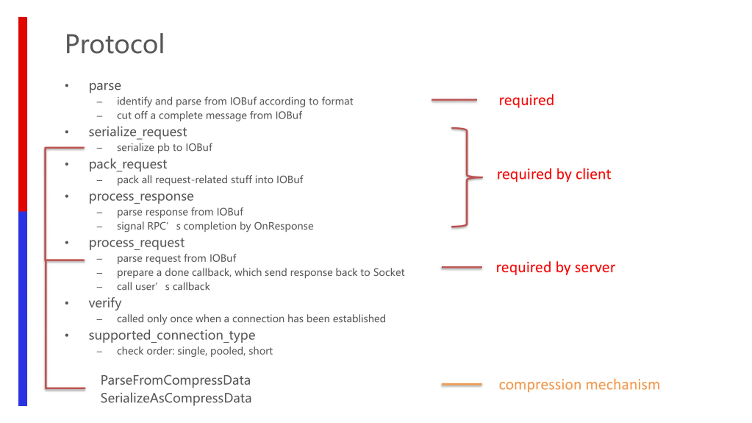 Protocol parse serialize_request serialize pb to IOBuf pack_request pack all request-related stuff into IOBuf process_response parse response from IOBuf signal RPC s completion by OnResponse process_request parse request from IOBuf prepare a done callback, which send response back to Socket call user s callback verify called only once when a connection has been established supported_connection_type check order: single, pooled, short required identify and parse from IOBuf according to format cut off a complete message from IOBuf required by client required by server ParseFromCompressData SerializeAsCompressData compression mechanism