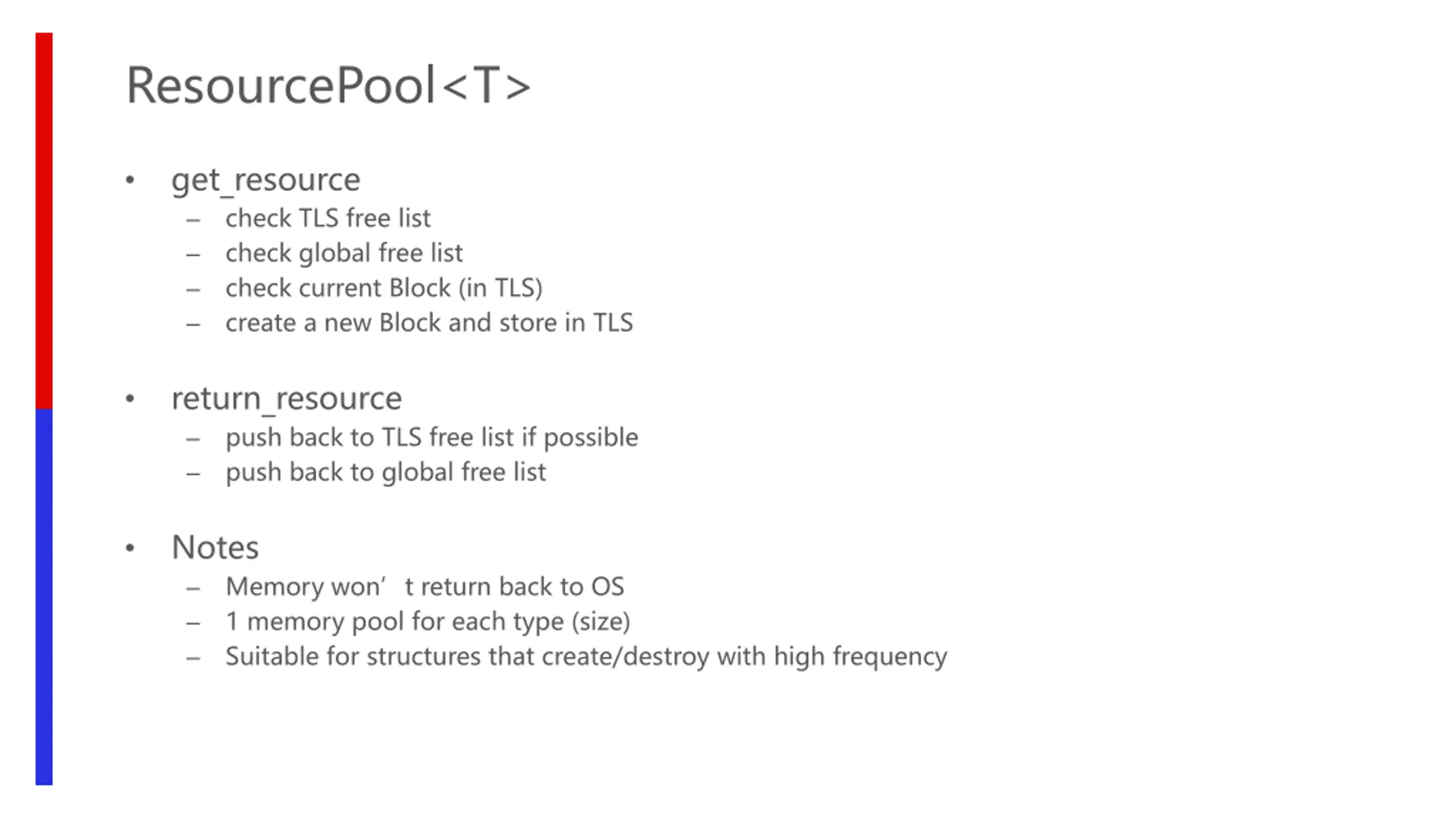 ResourcePool<T> get_resource check TLS free list check global free list check current Block (in TLS) create a new Block and store in TLS return_resource push back to TLS free list if possible push back to global free list Notes Memory won t return back to OS 1 memory pool for each type (size) Suitable for structures that create/destroy with high frequency