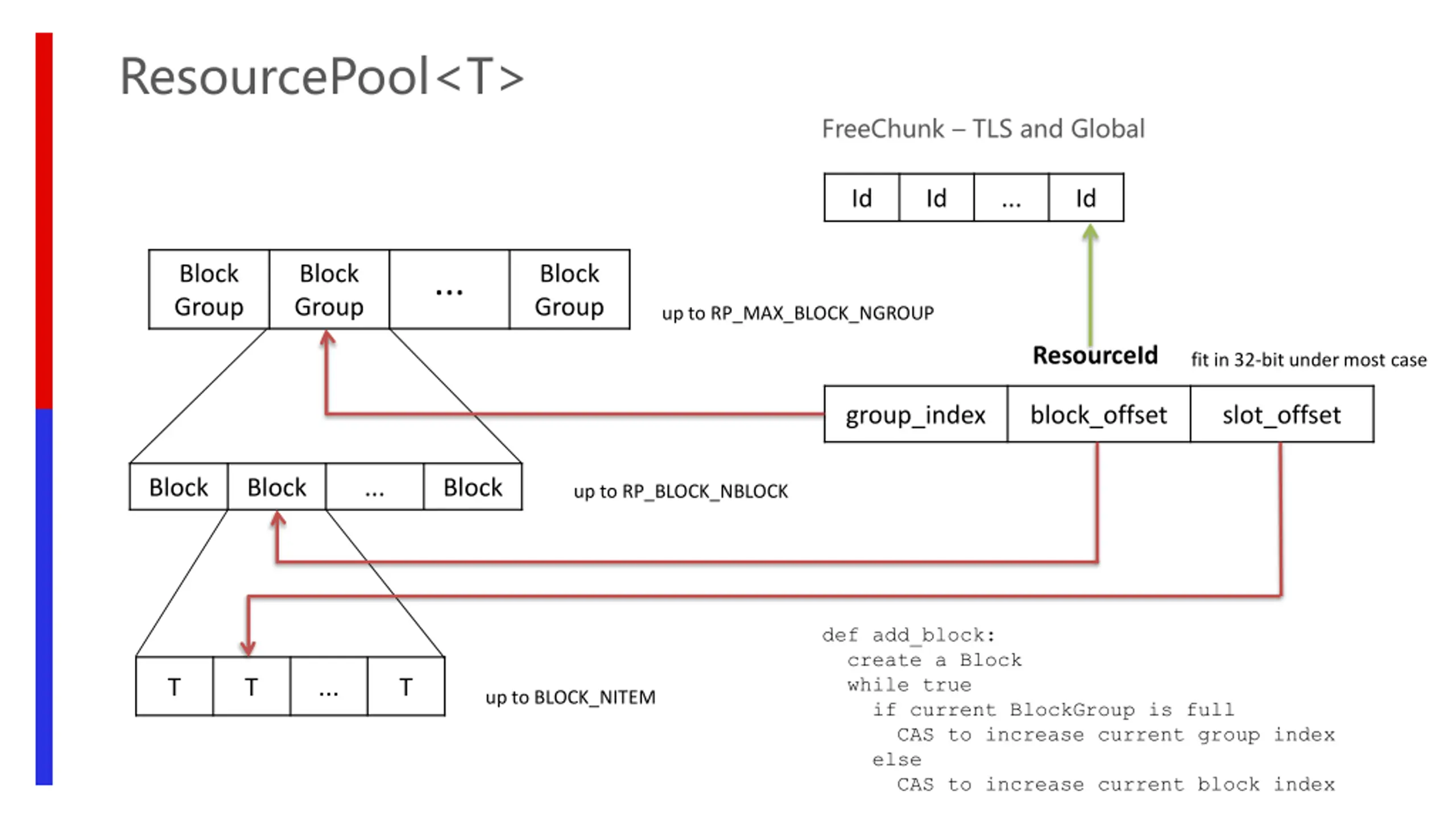 ResourcePool<T> FreeChunk TLS and Global Id Id ... Id Block Group Block Group Block Group ... up to RP_MAX_BLOCK_NGROUP ResourceId fit in 32-bit under most case group_index block_offset slot_offset Block Block ... Block up to RP_BLOCK_NBLOCK def add_block: create a Block while true if current BlockGroup is full CAS to increase current group index else CAS to increase current block index T T ... T up to BLOCK_NITEM
