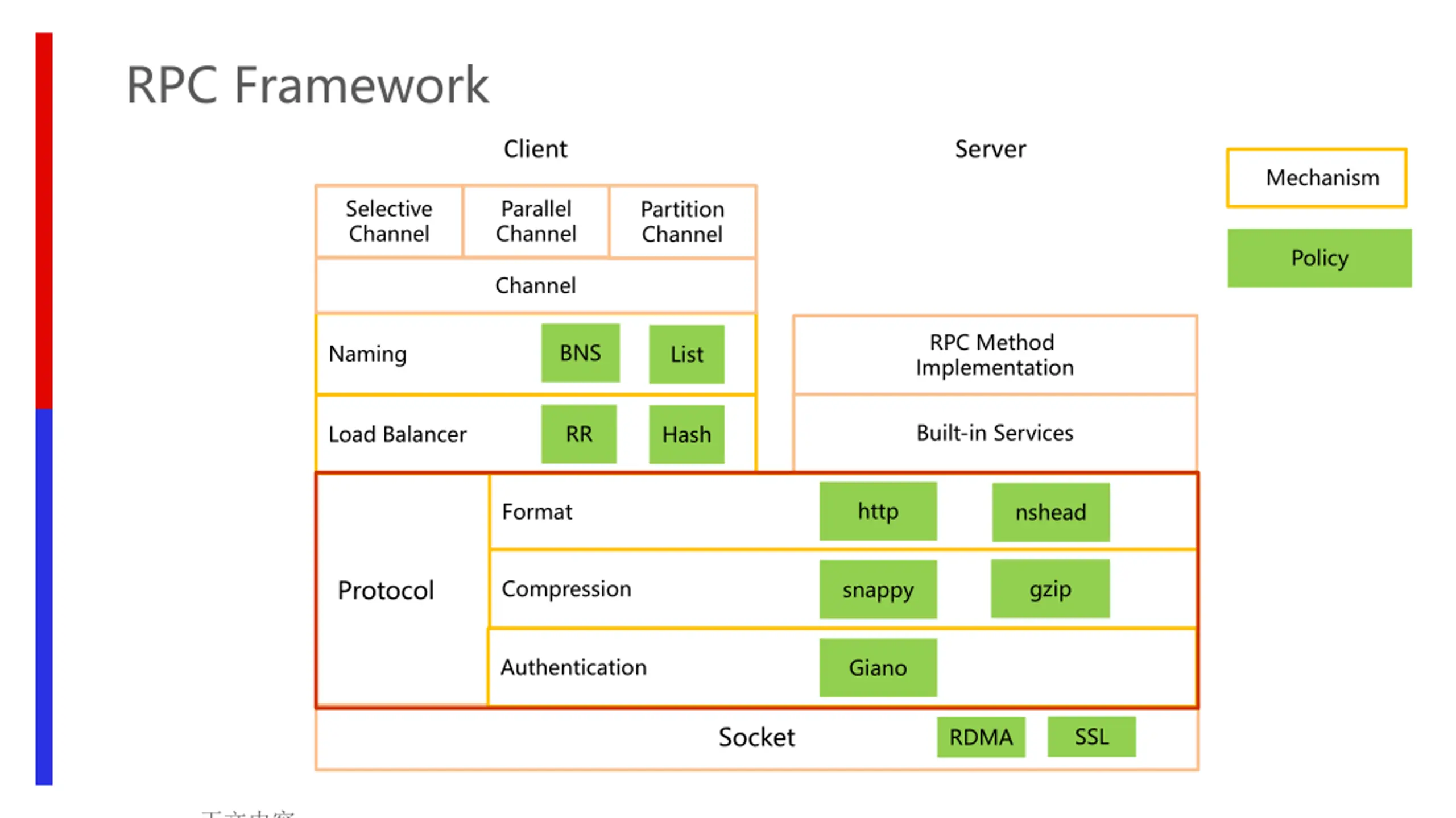 RPC Framework Client Server Mechanism Parallel Channel Selective Channel Partition Channel Policy Channel RPC Method Implementation BNS Naming List Built-in Services Load Balancer RR Hash http Format nshead Protocol Compression gzip snappy Authentication Giano Socket SSL RDMA