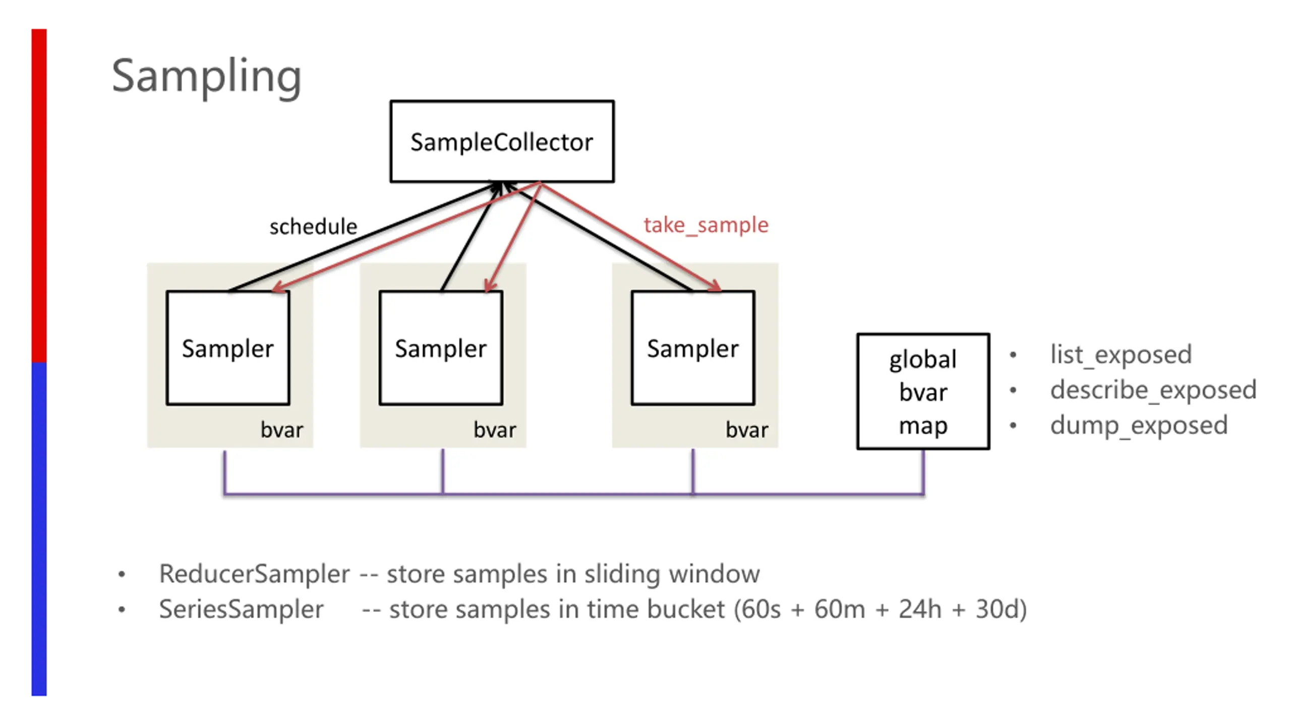 Sampling SampleCollector take_sample schedule Sampler Sampler Sampler list_exposed describe_exposed dump_exposed global bvar map bvar bvar bvar ReducerSampler -- store samples in sliding window SeriesSampler -- store samples in time bucket (60s + 60m + 24h + 30d)