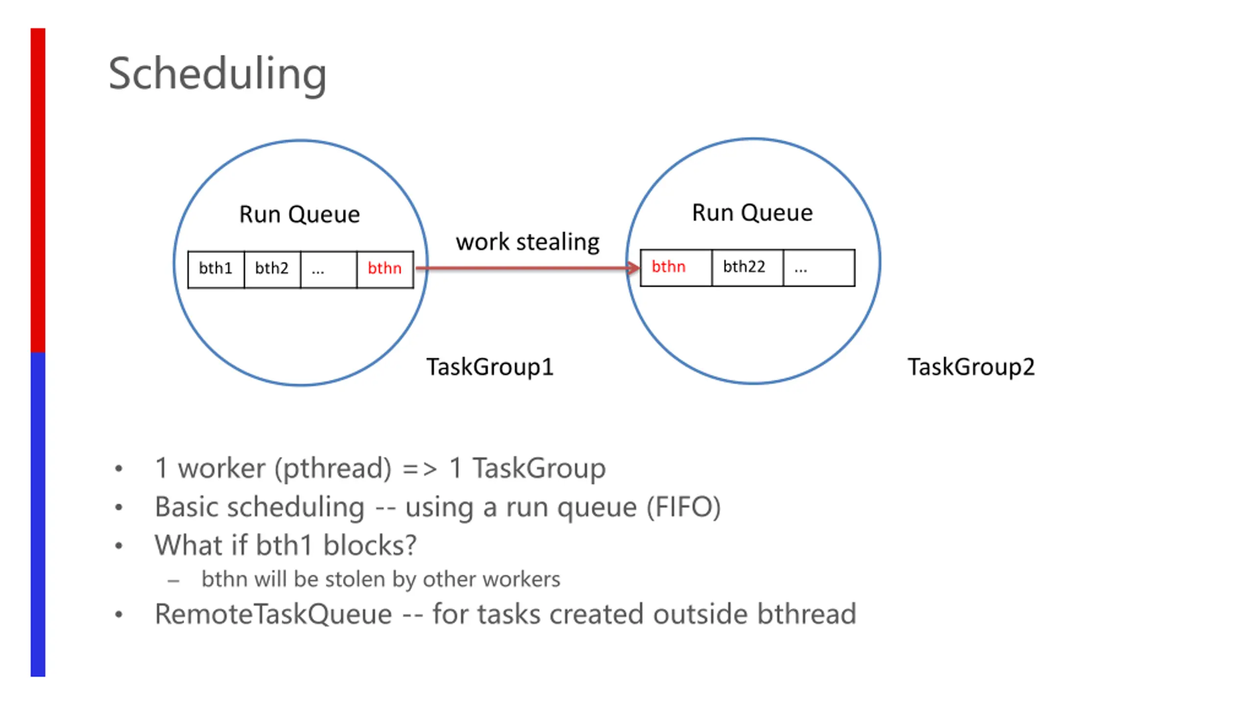 Scheduling Run Queue Run Queue work stealing bthn bth22 ... bth1 bth2 ... bthn TaskGroup1 TaskGroup2 1 worker (pthread) => 1 TaskGroup Basic scheduling -- using a run queue (FIFO) What if bth1 blocks? bthn will be stolen by other workers RemoteTaskQueue -- for tasks created outside bthread