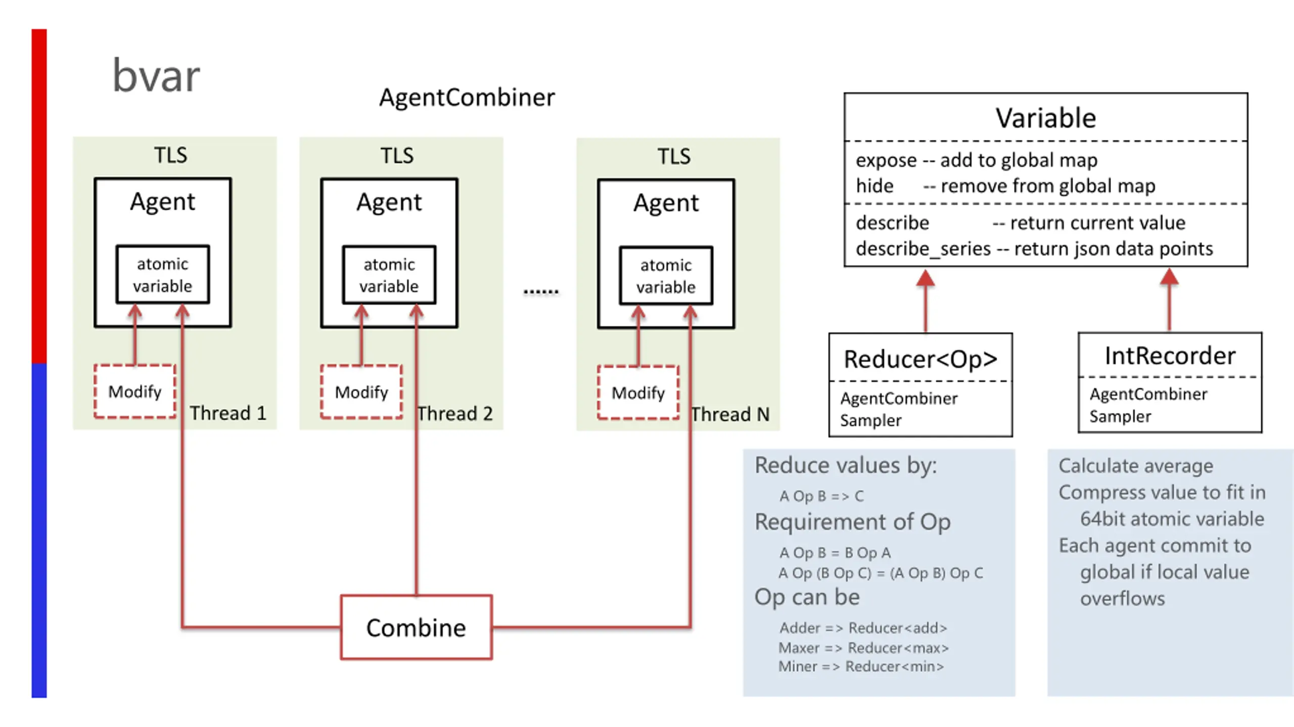 bvar AgentCombiner Variable TLS TLS TLS expose -- add to global map hide -- remove from global map Agent Agent Agent describe -- return current value describe_series -- return json data points atomic variable atomic variable atomic variable IntRecorder Reducer<Op> Modify Modify Modify AgentCombiner Sampler AgentCombiner Sampler Thread 1 Thread 2 Thread N Reduce values by: Calculate average Compress value to fit in 64bit atomic variable Each agent commit to global if local value overflows A Op B => C Requirement of Op A Op B = B Op A A Op (B Op C) = (A Op B) Op C Op can be Combine Adder => Reducer<add> Maxer => Reducer<max> Miner => Reducer<min>