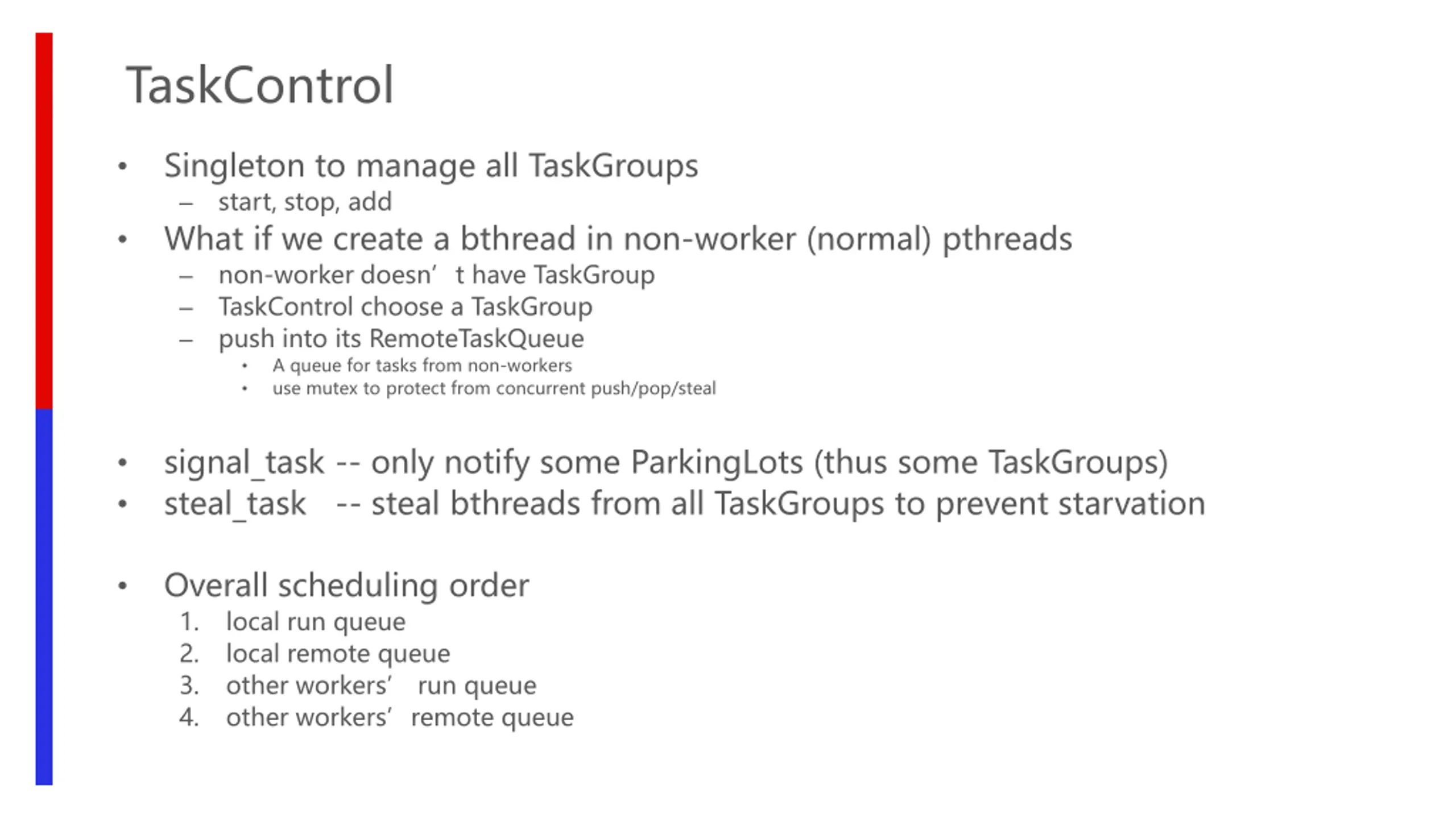 TaskControl Singleton to manage all TaskGroups start, stop, add What if we create a bthread in non-worker (normal) pthreads non-worker doesn t have TaskGroup TaskControl choose a TaskGroup push into its RemoteTaskQueue A queue for tasks from non-workers use mutex to protect from concurrent push/pop/steal signal_task -- only notify some ParkingLots (thus some TaskGroups) steal_task -- steal bthreads from all TaskGroups to prevent starvation Overall scheduling order 1. local run queue 2. local remote queue 3. other workers run queue 4. other workers remote queue