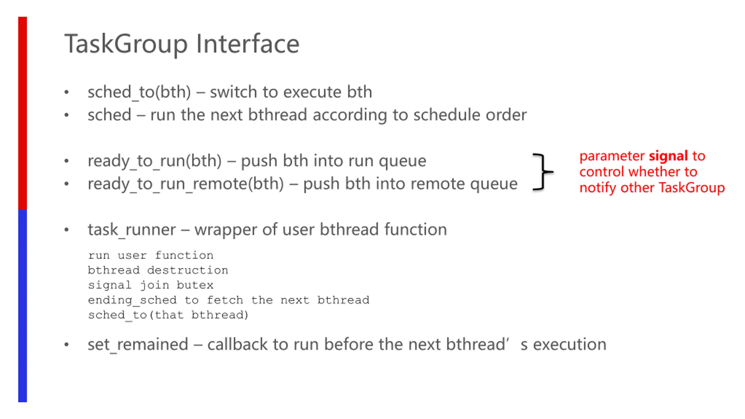 TaskGroup Interface sched_to(bth) switch to execute bth sched run the next bthread according to schedule order parameter signal to control whether to notify other TaskGroup ready_to_run(bth) push bth into run queue ready_to_run_remote(bth) push bth into remote queue task_runner wrapper of user bthread function run user function bthread destruction signal join butex ending_sched to fetch the next bthread sched_to(that bthread) set_remained callback to run before the next bthread s execution