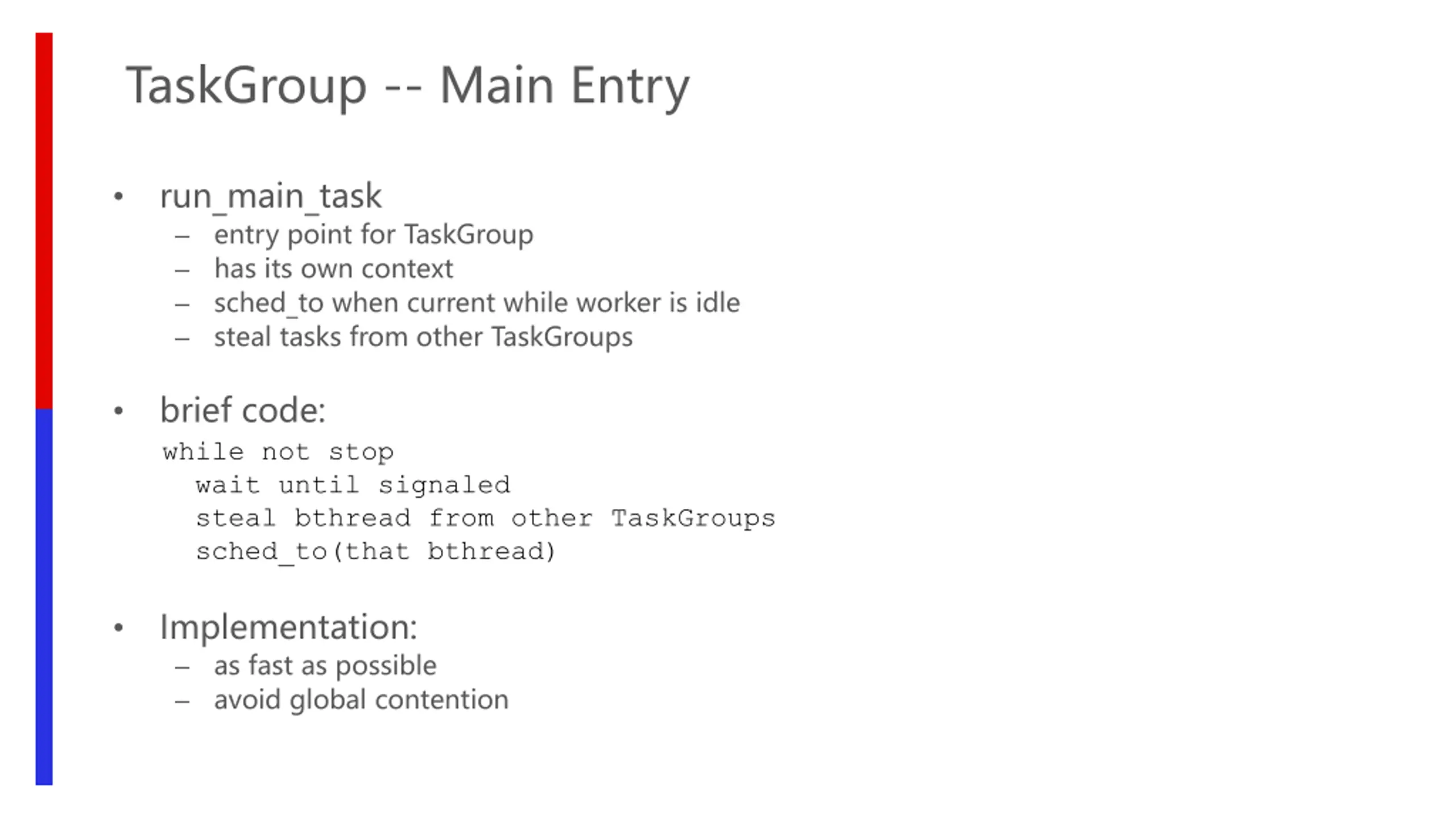 TaskGroup -- Main Entry run_main_task entry point for TaskGroup has its own context sched_to when current while worker is idle steal tasks from other TaskGroups brief code: while not stop wait until signaled steal bthread from other TaskGroups sched_to(that bthread) Implementation: as fast as possible avoid global contention