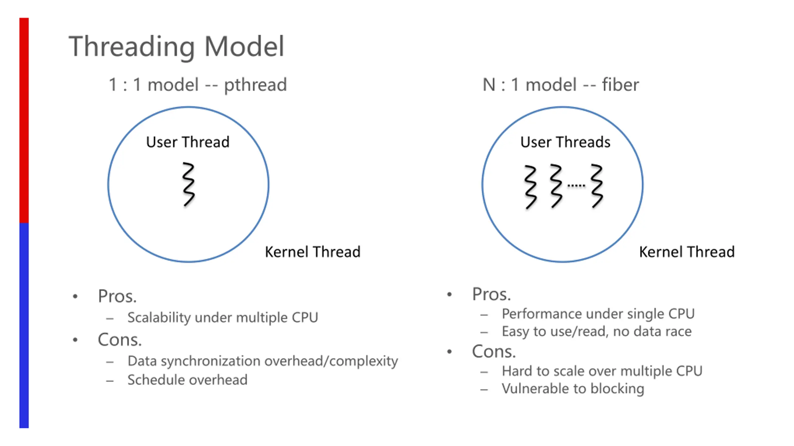 Threading Model 1 : 1 model -- pthread N : 1 model -- fiber User Thread User Threads Kernel Thread Kernel Thread Pros. Cons. Pros. Cons. Performance under single CPU Easy to use/read, no data race Scalability under multiple CPU Data synchronization overhead/complexity Schedule overhead Hard to scale over multiple CPU Vulnerable to blocking
