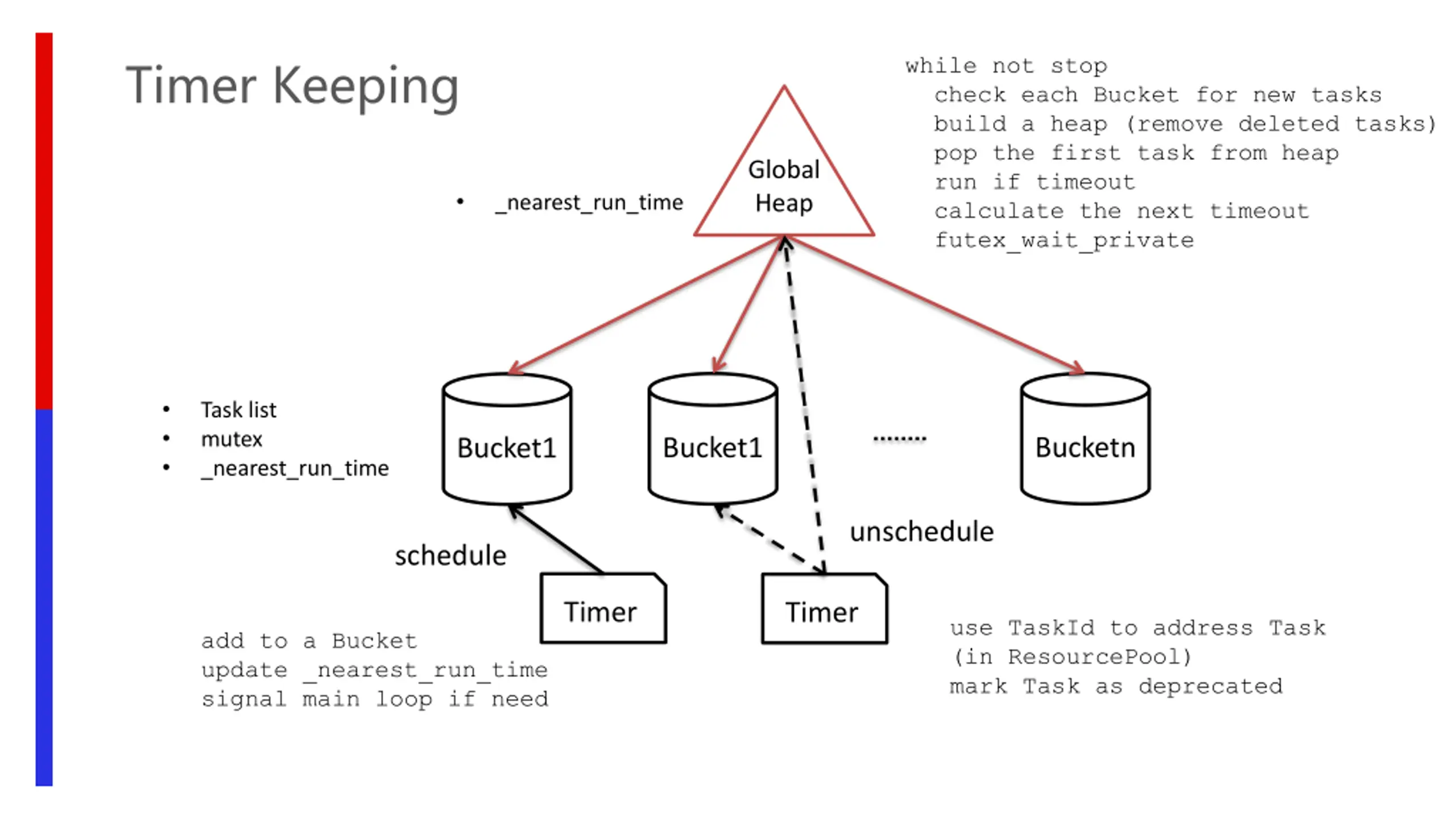 Timer Keeping while not stop check each Bucket for new tasks build a heap (remove deleted tasks) pop the first task from heap run if timeout calculate the next timeout futex_wait_private Global Heap _nearest_run_time Task list mutex _nearest_run_time Bucketn Bucket1 Bucket1 unschedule schedule Timer Timer use TaskId to address Task (in ResourcePool) mark Task as deprecated add to a Bucket update _nearest_run_time signal main loop if need
