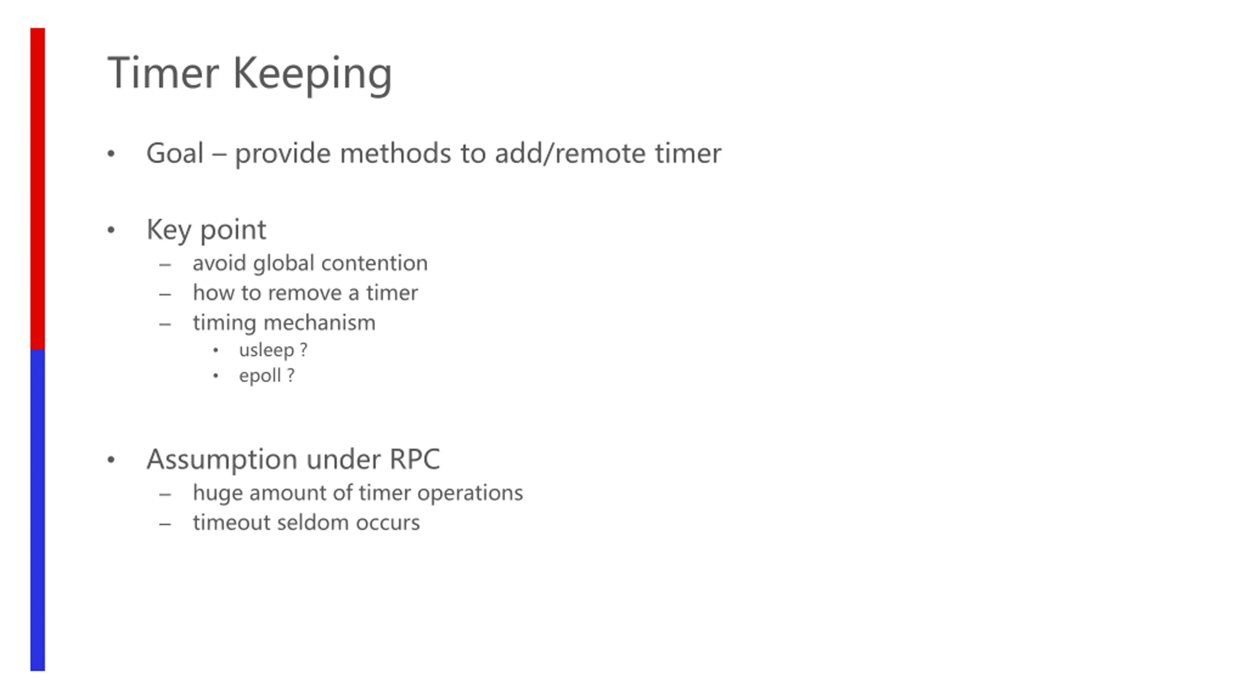 Timer Keeping Goal provide methods to add/remote timer Key point avoid global contention how to remove a timer timing mechanism usleep ? epoll ? Assumption under RPC huge amount of timer operations timeout seldom occurs