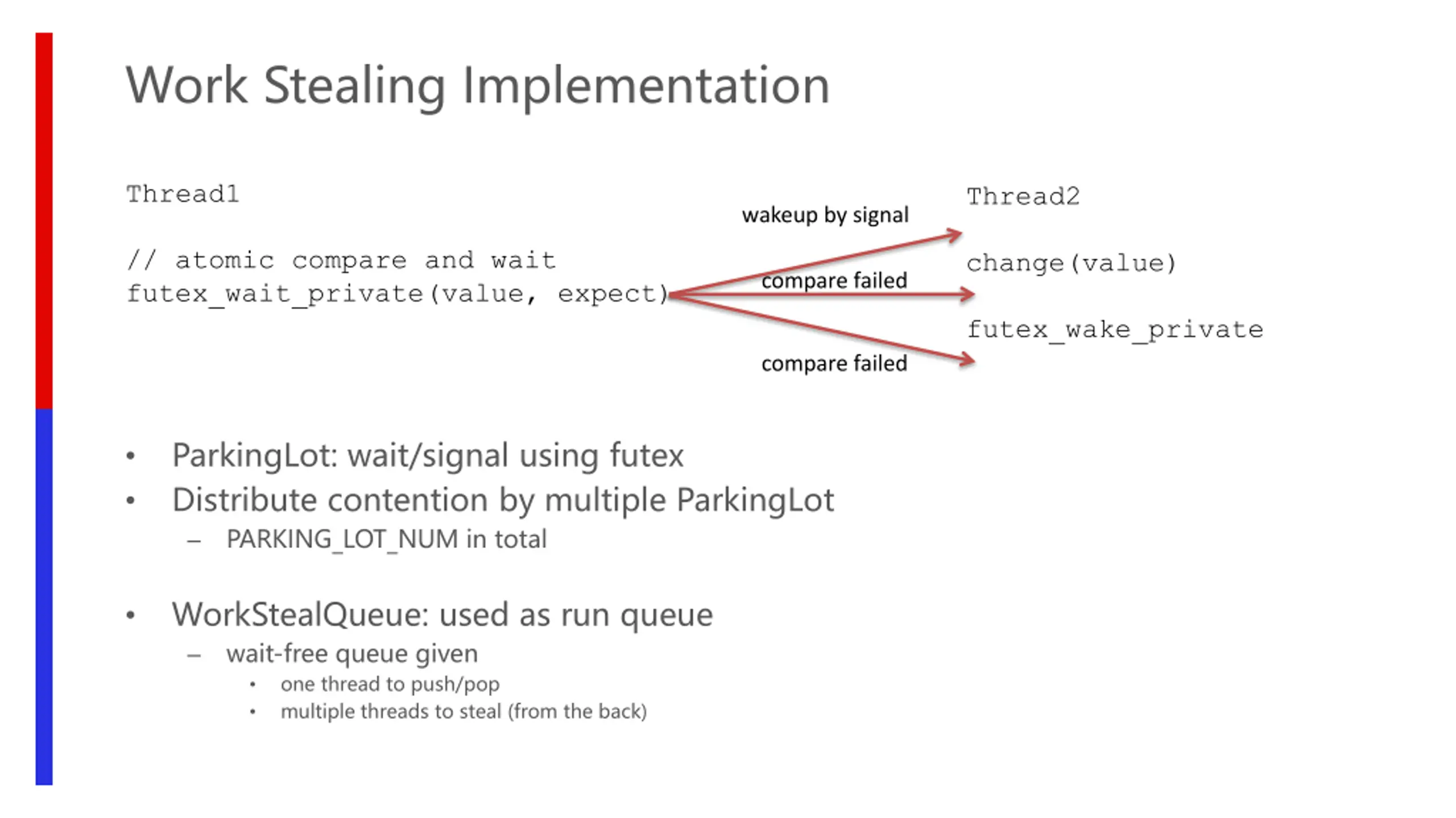 Work Stealing Implementation Thread1 Thread2 wakeup by signal // atomic compare and wait futex_wait_private(value, expect) change(value) compare failed futex_wake_private compare failed ParkingLot: wait/signal using futex Distribute contention by multiple ParkingLot PARKING_LOT_NUM in total WorkStealQueue: used as run queue wait-free queue given one thread to push/pop multiple threads to steal (from the back)