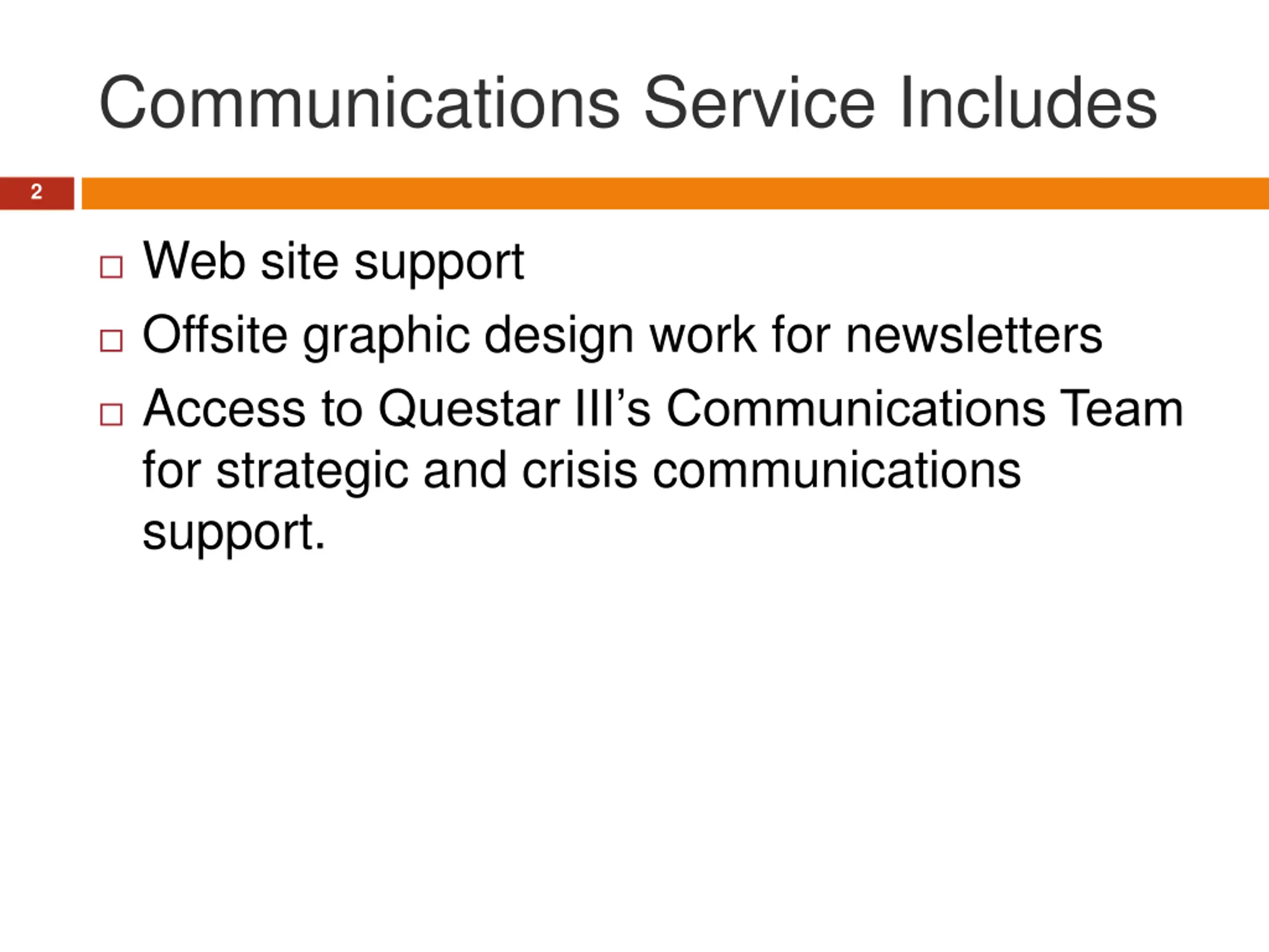 Communications Service Includes 2 Web site support Offsite graphic design work for newsletters Access to Questar III s Communications Team for strategic and crisis communications support.