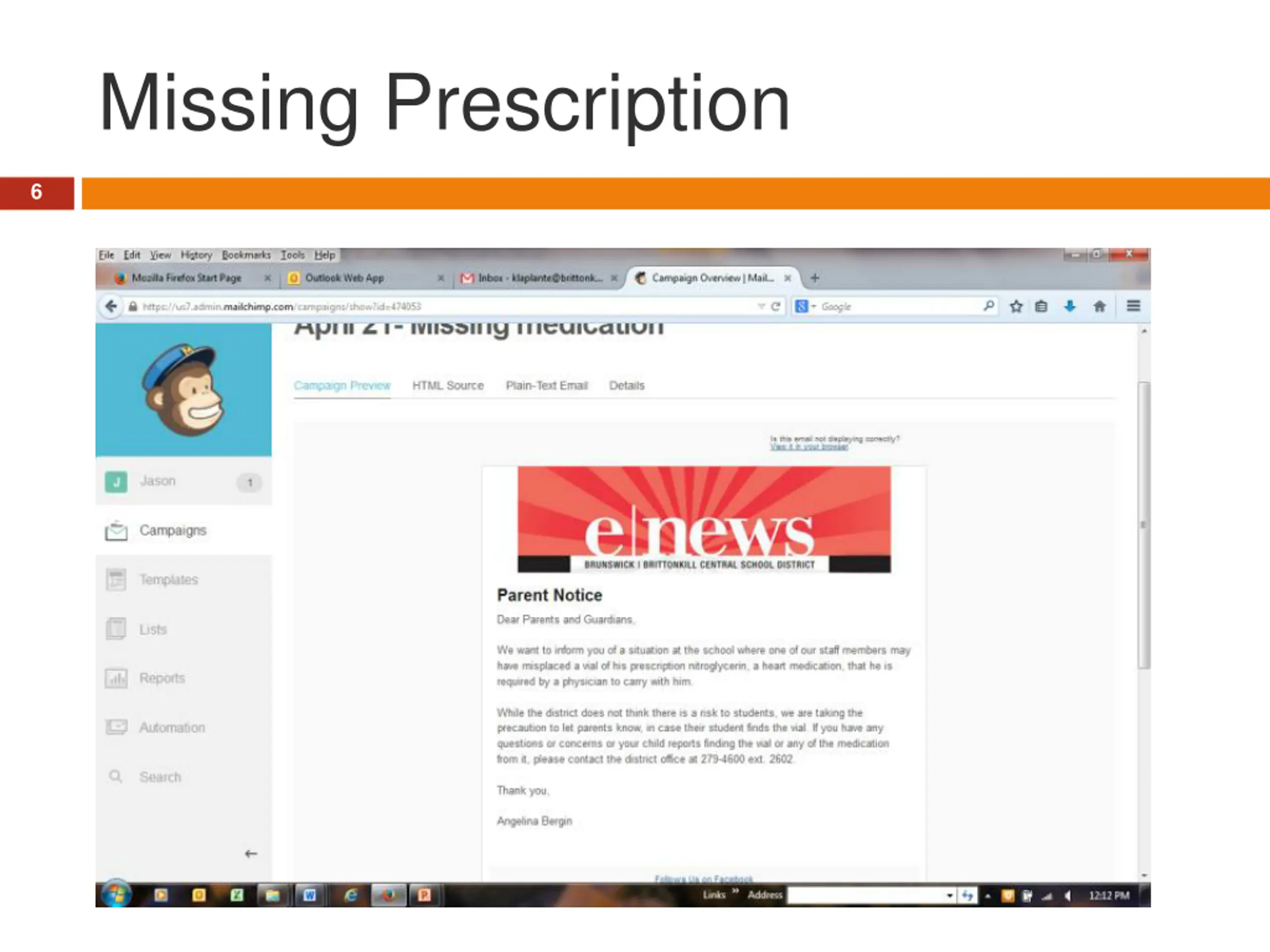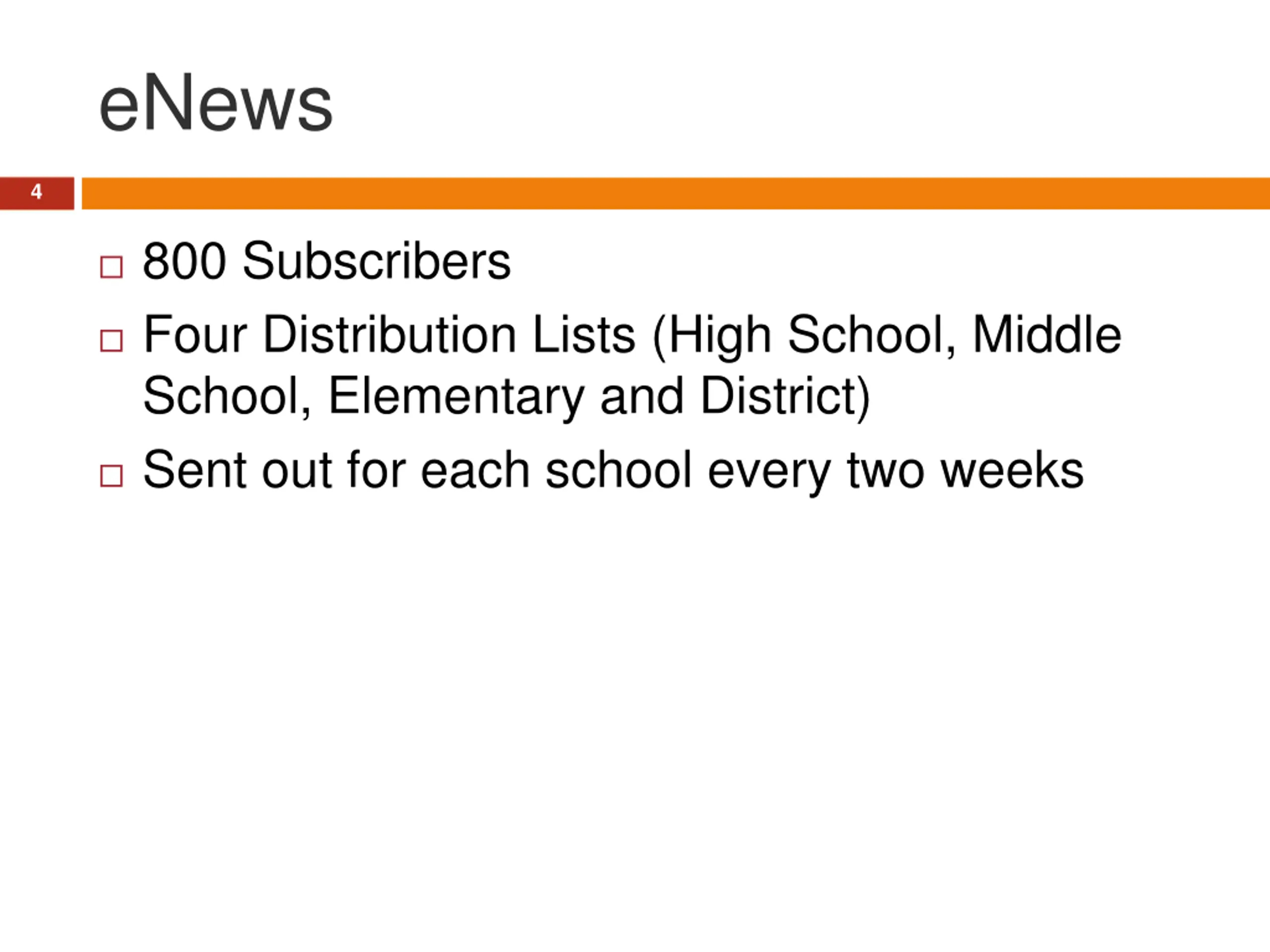 eNews 4 800 Subscribers Four Distribution Lists (High School, Middle School, Elementary and District) Sent out for each school every two weeks