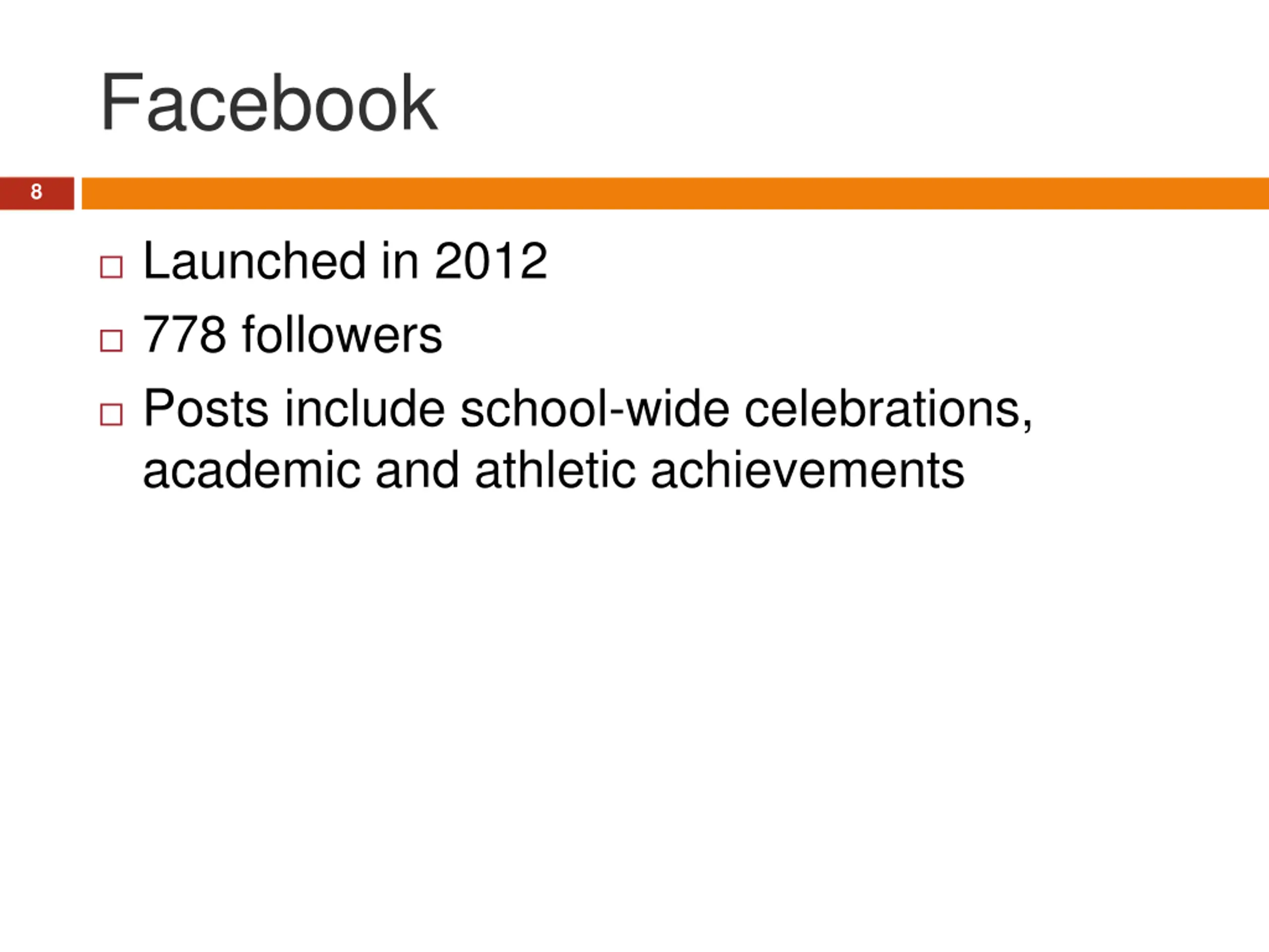 Facebook 8 Launched in 2012 778 followers Posts include school-wide celebrations, academic and athletic achievements
