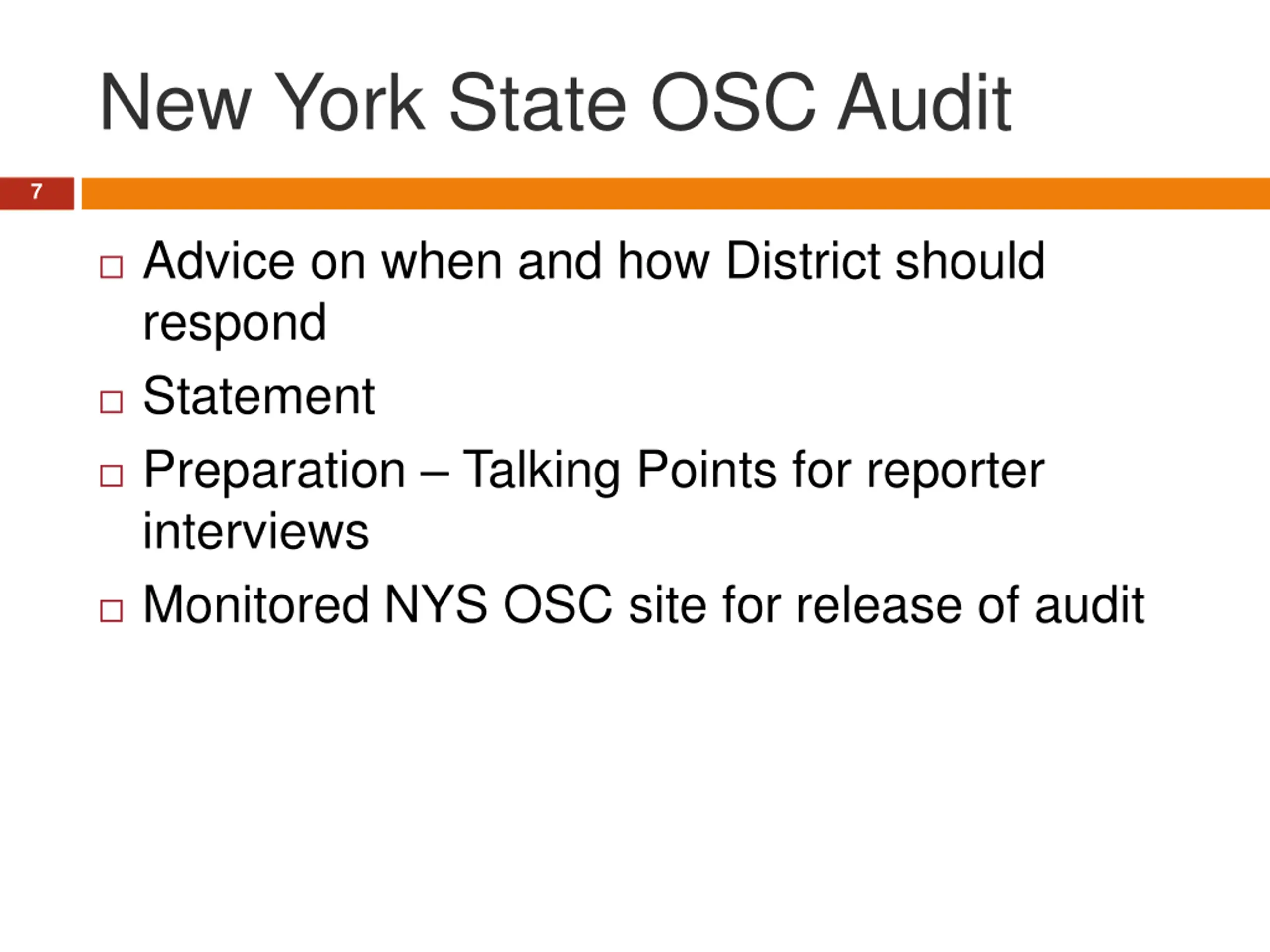 New York State OSC Audit 7 Advice on when and how District should respond Statement Preparation Talking Points for reporter interviews Monitored NYS OSC site for release of audit