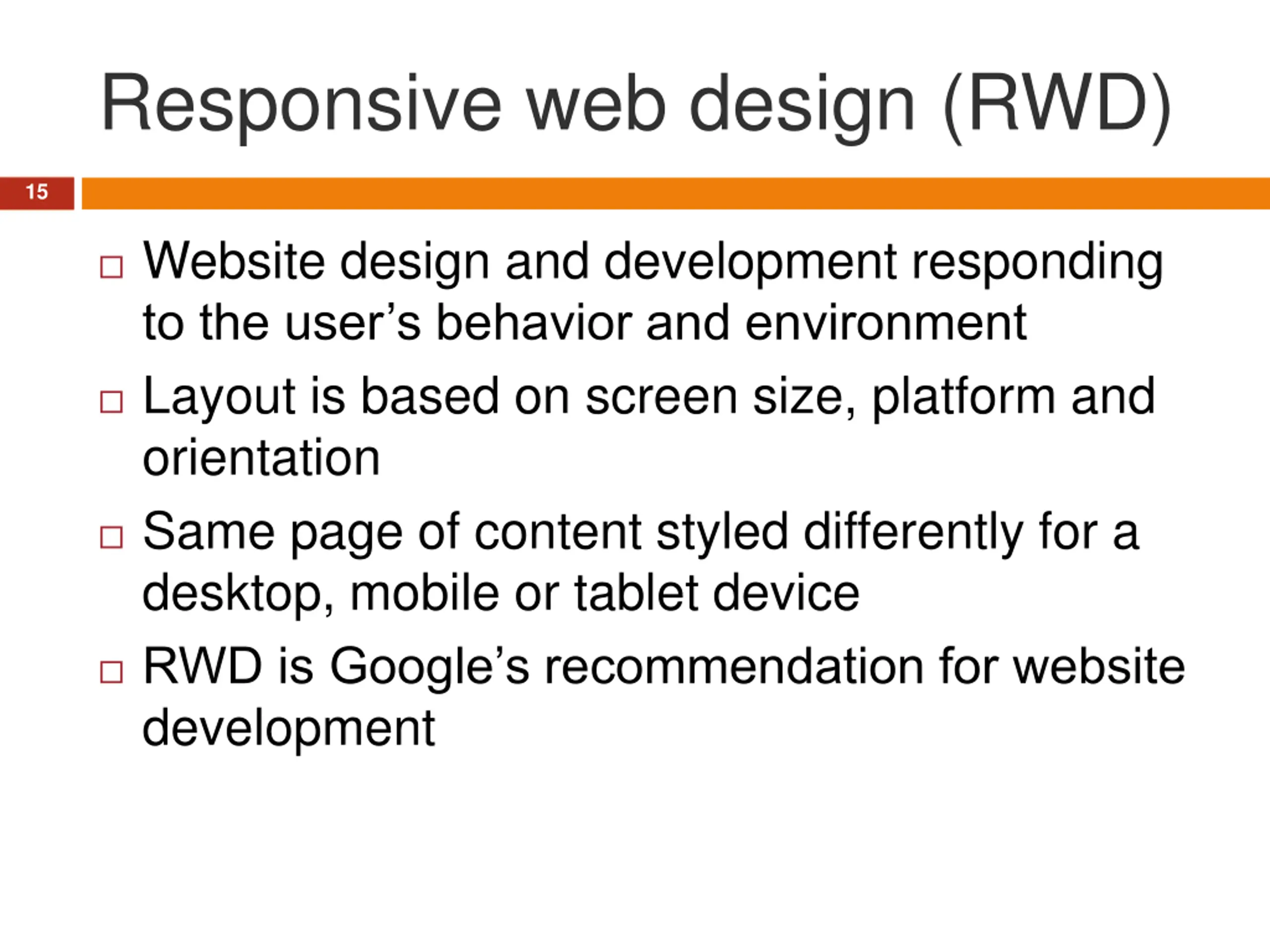 Responsive web design (RWD) 15 Website design and development responding to the user s behavior and environment Layout is based on screen size, platform and orientation Same page of content styled differently for a desktop, mobile or tablet device RWD is Google s recommendation for website development
