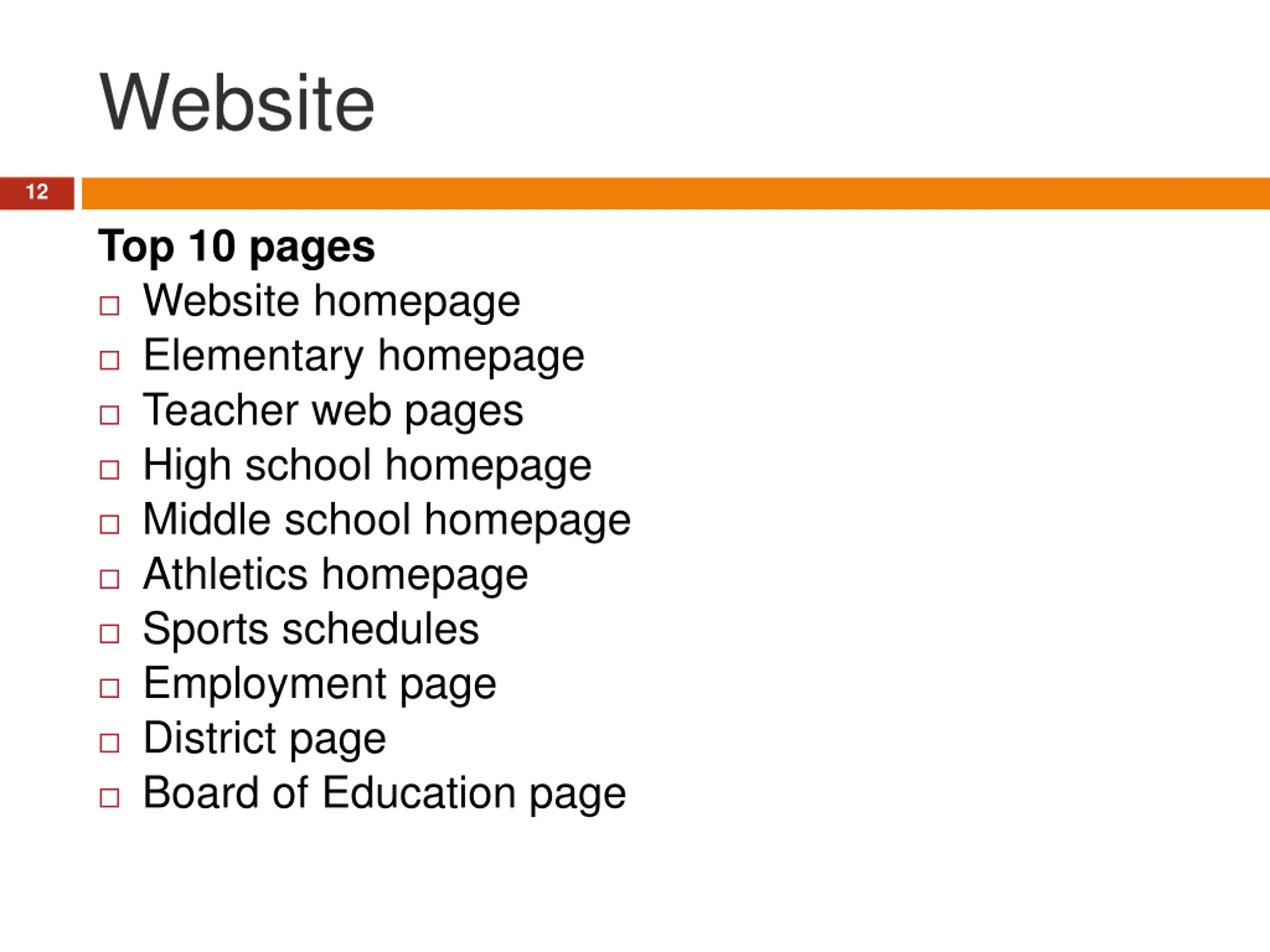Website 12 Top 10 pages Website homepage Elementary homepage Teacher web pages High school homepage Middle school homepage Athletics homepage Sports schedules Employment page District page Board of Education page