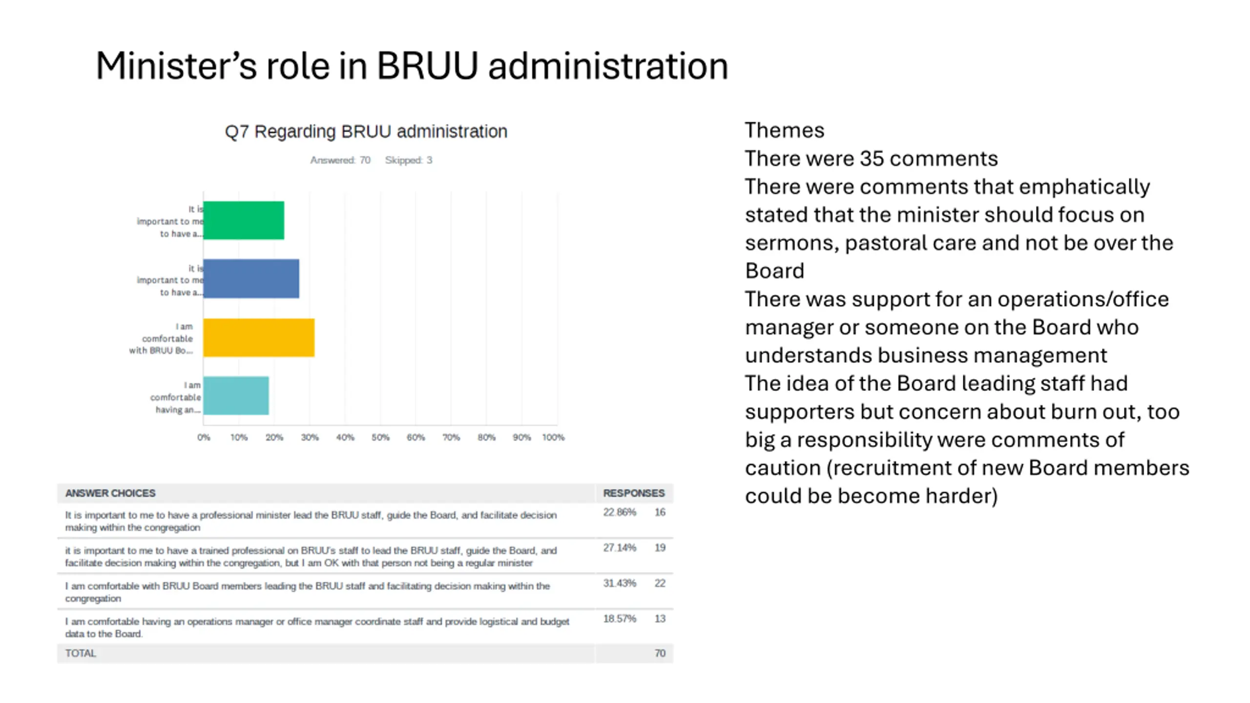 Ministers role in BRUU administration Themes There were 35 comments There were comments that emphatically stated that the minister should focus on sermons, pastoral care and not be over the Board There was support for an operations/office manager or someone on the Board who understands business management The idea of the Board leading staff had supporters but concern about burn out, too big a responsibility were comments of caution (recruitment of new Board members could be become harder)