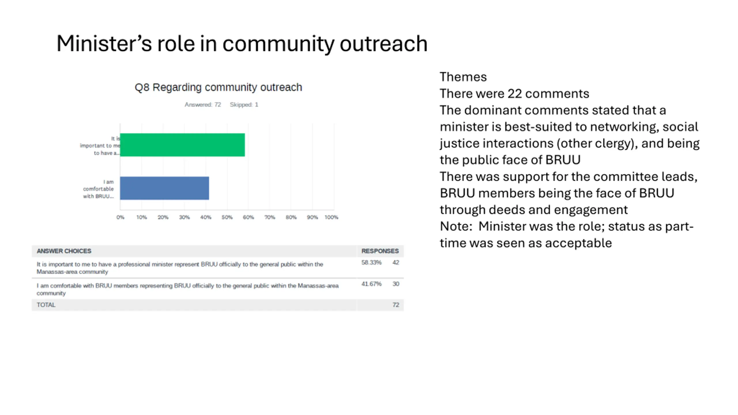 Ministers role in community outreach Themes There were 22 comments The dominant comments stated that a minister is best-suited to networking, social justice interactions (other clergy), and being the public face of BRUU There was support for the committee leads, BRUU members being the face of BRUU through deeds and engagement Note: Minister was the role; status as part- time was seen as acceptable