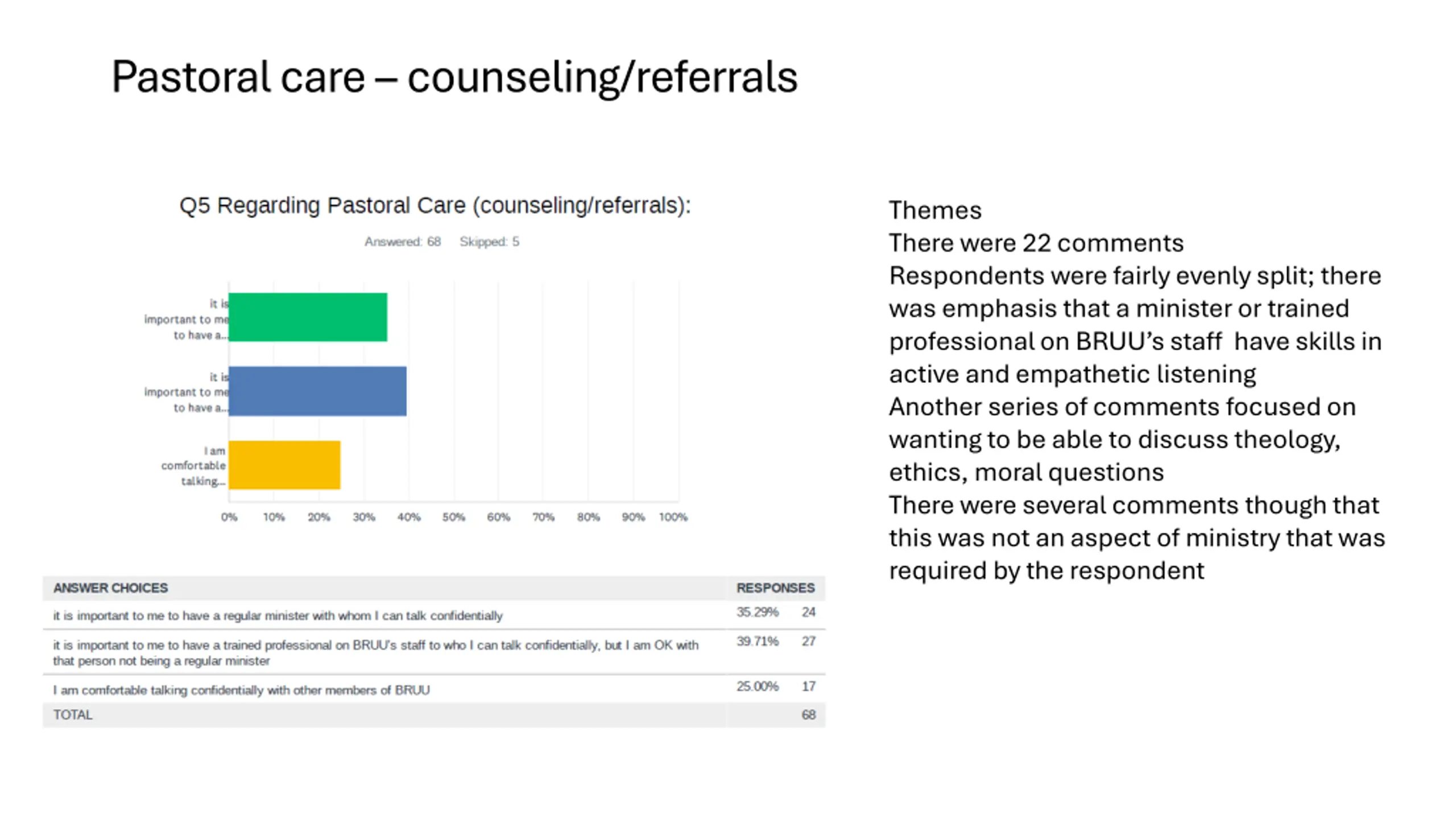Pastoral care counseling/referrals Themes There were 22 comments Respondents were fairly evenly split; there was emphasis that a minister or trained professional on BRUU s staff have skills in active and empathetic listening Another series of comments focused on wanting to be able to discuss theology, ethics, moral questions There were several comments though that this was not an aspect of ministry that was required by the respondent