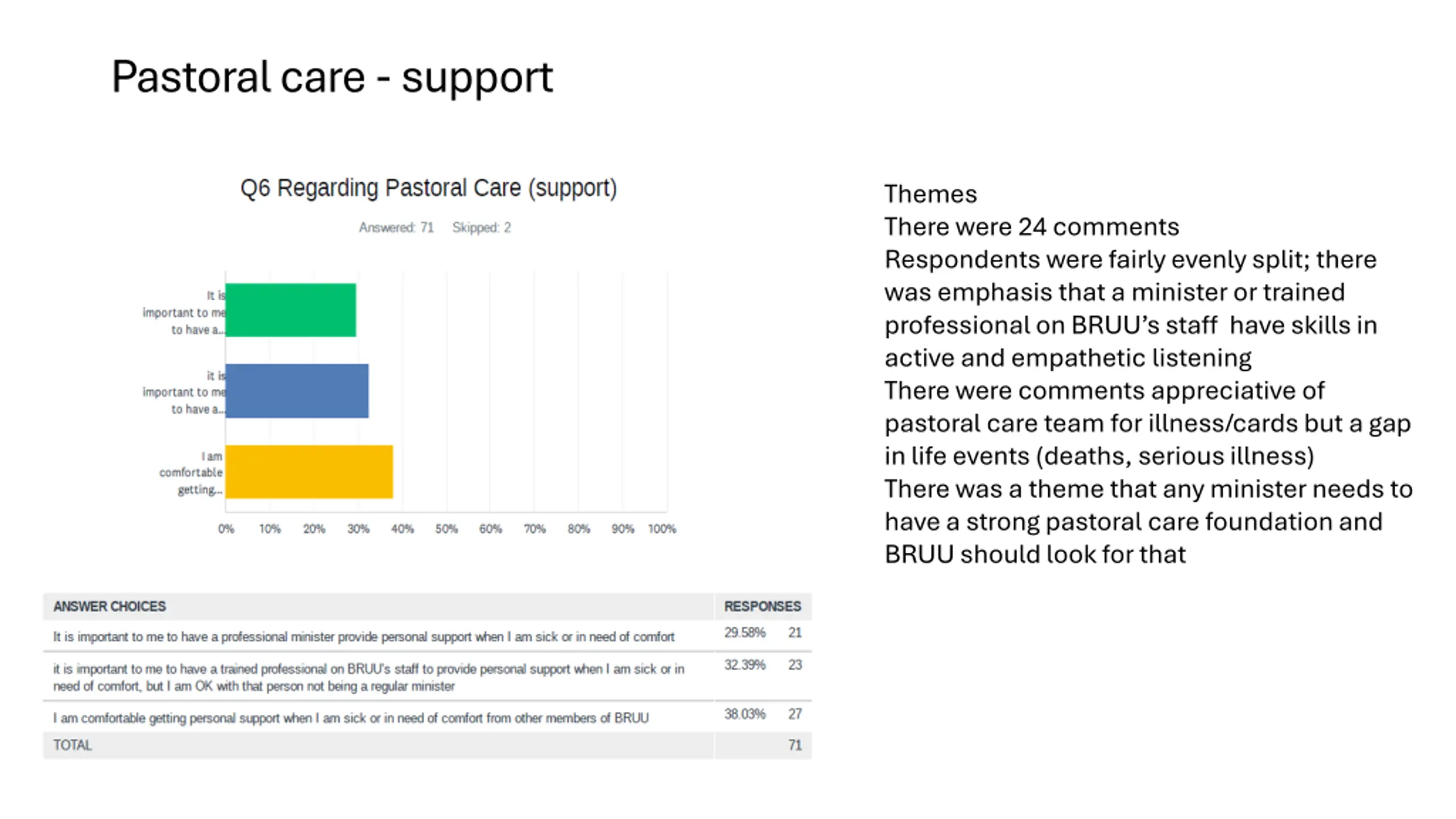 Pastoral care - support Themes There were 24 comments Respondents were fairly evenly split; there was emphasis that a minister or trained professional on BRUU s staff have skills in active and empathetic listening There were comments appreciative of pastoral care team for illness/cards but a gap in life events (deaths, serious illness) There was a theme that any minister needs to have a strong pastoral care foundation and BRUU should look for that
