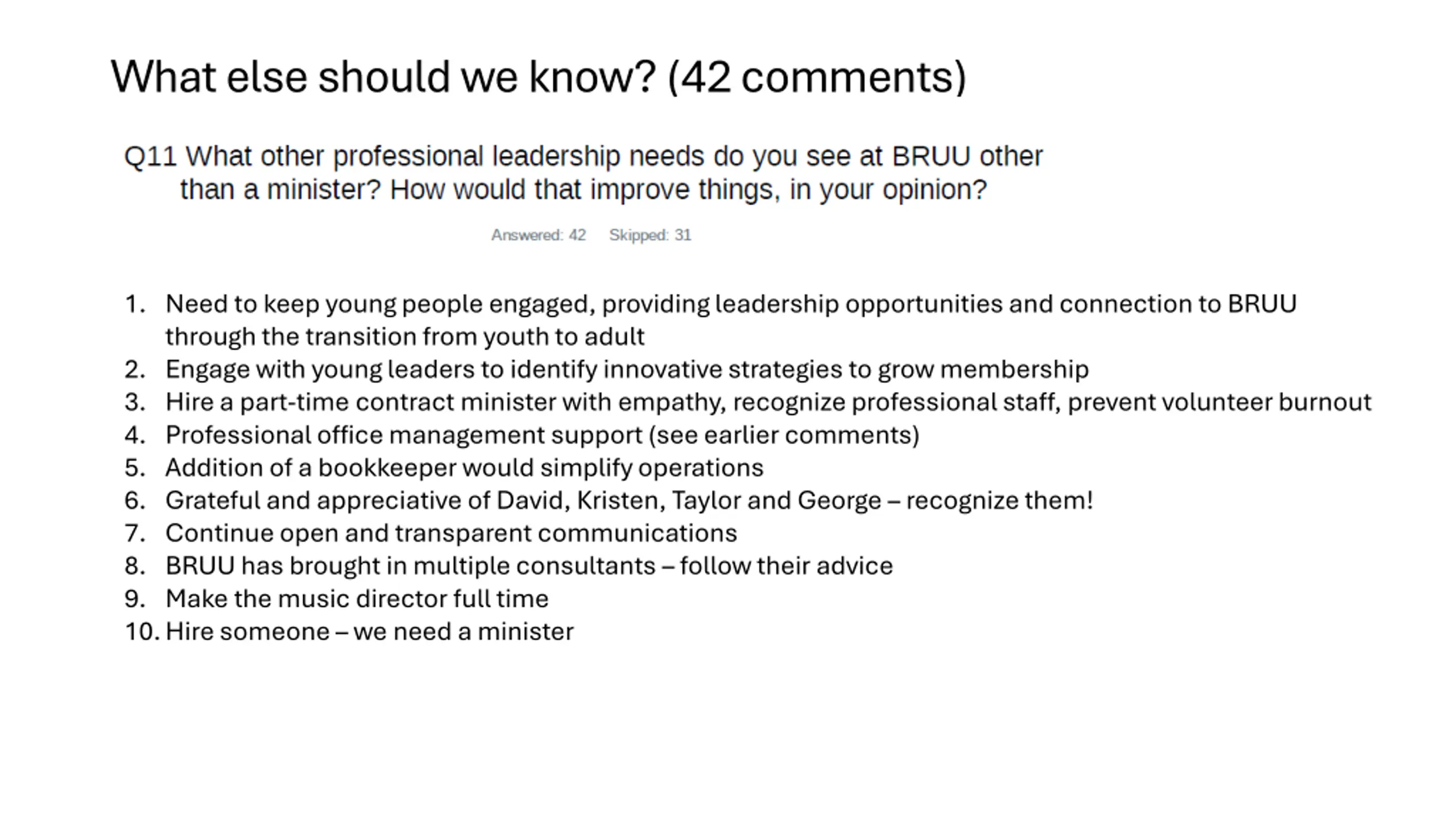 What else should we know? (42 comments) 1. Need to keep young people engaged, providing leadership opportunities and connection to BRUU through the transition from youth to adult 2. Engage with young leaders to identify innovative strategies to grow membership 3. Hire a part-time contract minister with empathy, recognize professional staff, prevent volunteer burnout 4. Professional office management support (see earlier comments) 5. Addition of a bookkeeper would simplify operations 6. Grateful and appreciative of David, Kristen, Taylor and George recognize them! 7. Continue open and transparent communications 8. BRUU has brought in multiple consultants follow their advice 9. Make the music director full time 10.Hire someone we need a minister