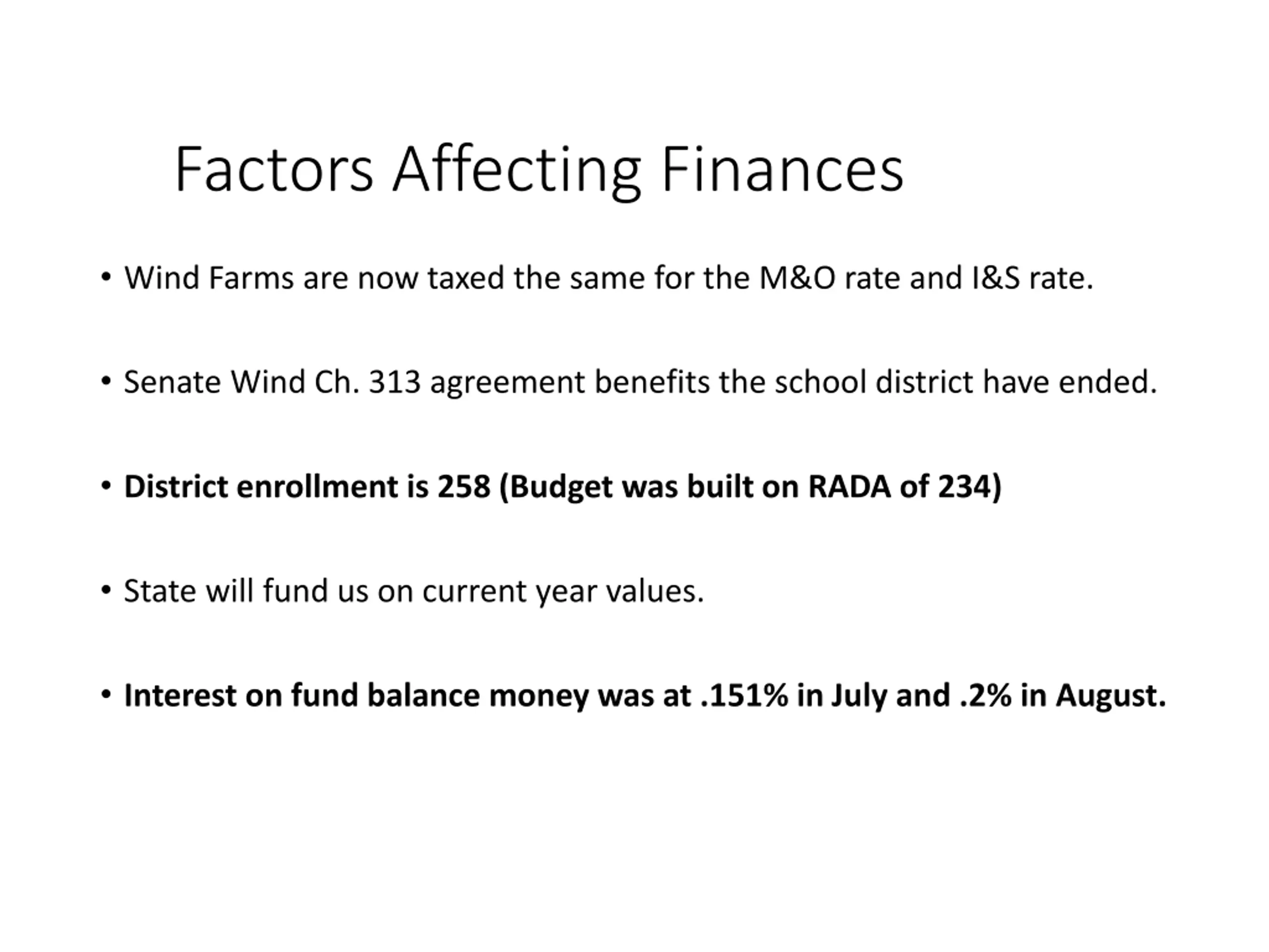 Factors Affecting Finances Wind Farms are now taxed the same for the M&O rate and I&S rate. Senate Wind Ch. 313 agreement benefits the school district have ended. District enrollment is 258 (Budget was built on RADA of 234) State will fund us on current year values. Interest on fund balance money was at .151% in July and .2% in August.