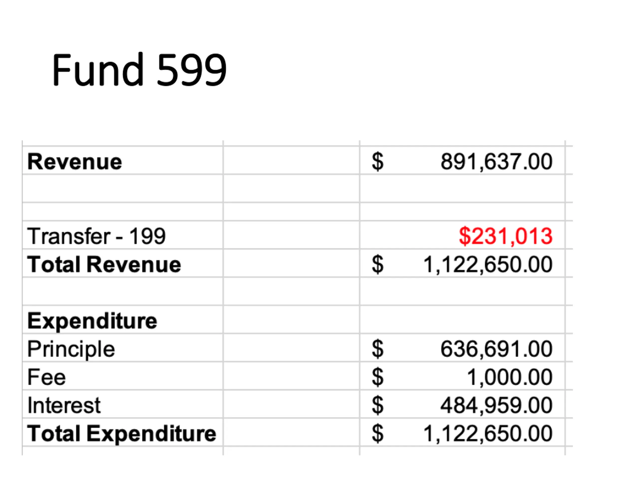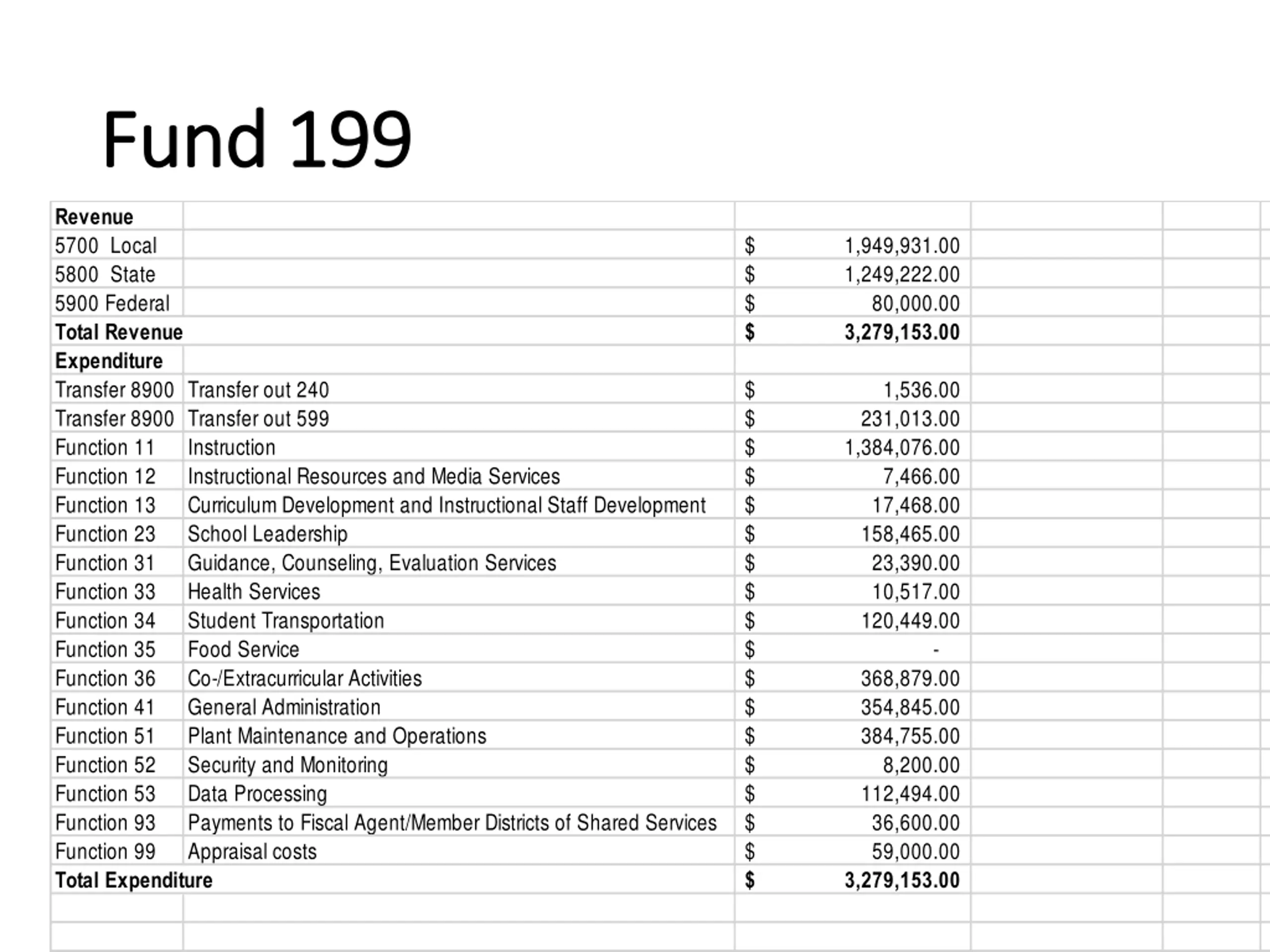 Fund 199 Fund 199 Revenue 5700 Local 5800 State 5900 Federal Total Revenue Expenditure Transfer 8900 Transfer out 240 Transfer 8900 Transfer out 599 Function 11 Instruction Function 12 Instructional Resources and Media Services Function 13 Curriculum Development and Instructional Staff Development Function 23 School Leadership Function 31 Guidance, Counseling, Evaluation Services Function 33 Health Services Function 34 Student Transportation Function 35 Food Service Function 36 Co-/Extracurricular Activities Function 41 General Administration Function 51 Plant Maintenance and Operations Function 52 Security and Monitoring Function 53 Data Processing Function 93 Payments to Fiscal Agent/Member Districts of Shared Services Function 99 Appraisal costs Total Expenditure $ $ $ $ 1,949,931.00 1,249,222.00 80,000.00 3,279,153.00 $ $ $ $ $ $ $ $ $ $ $ $ $ $ $ $ $ $ 1,536.00 231,013.00 1,384,076.00 7,466.00 17,468.00 158,465.00 23,390.00 10,517.00 120,449.00 - 368,879.00 354,845.00 384,755.00 8,200.00 112,494.00 36,600.00 59,000.00 3,279,153.00