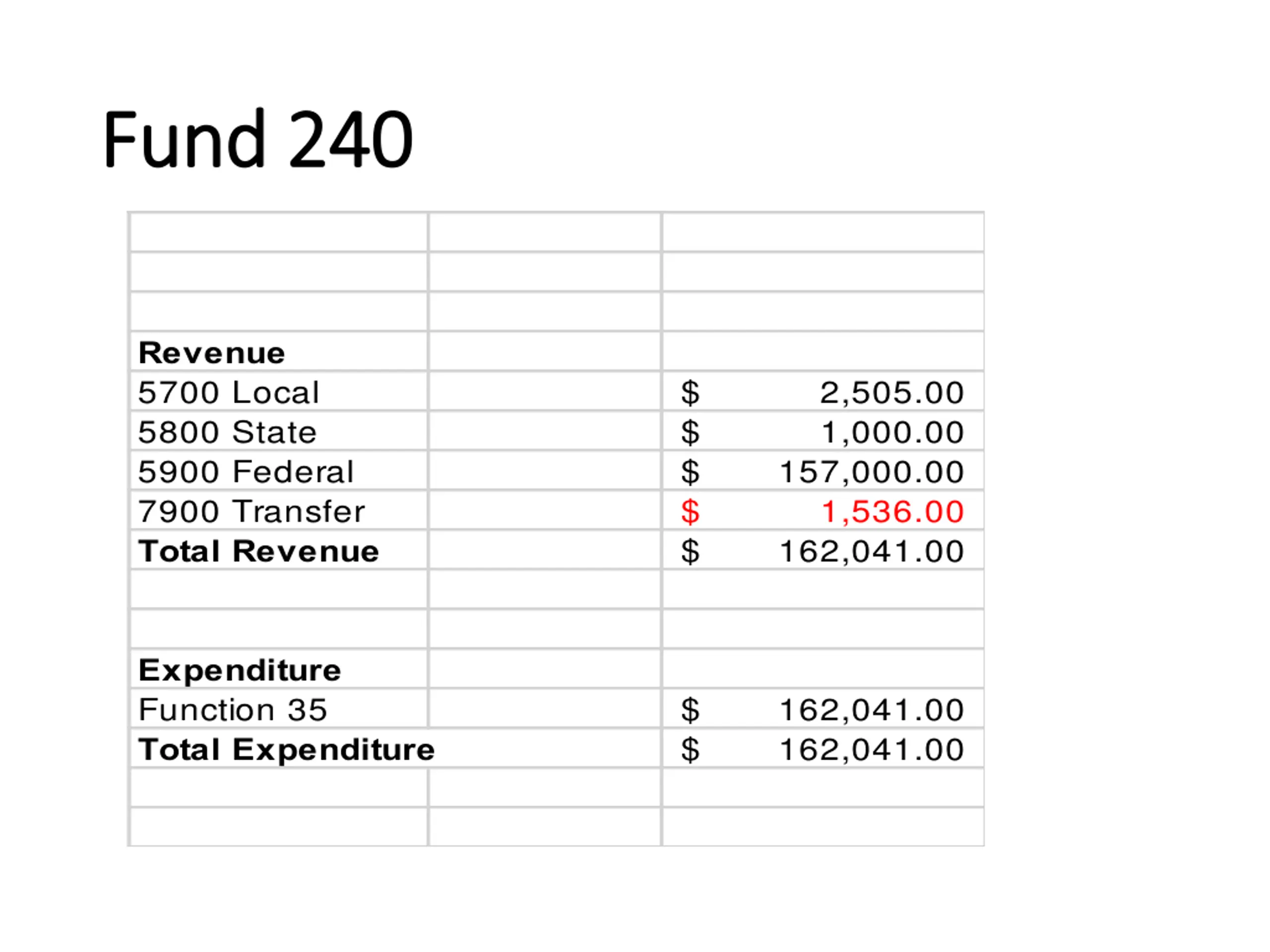 Fund 240 Fund 240 Revenue 5700 Local 5800 State 5900 Federal 7900 Transfer Total Revenue $ $ $ $ $ 2,505.00 1,000.00 157,000.00 1,536.00 162,041.00 Expenditure Function 35 Total Expenditure $ $ 162,041.00 162,041.00