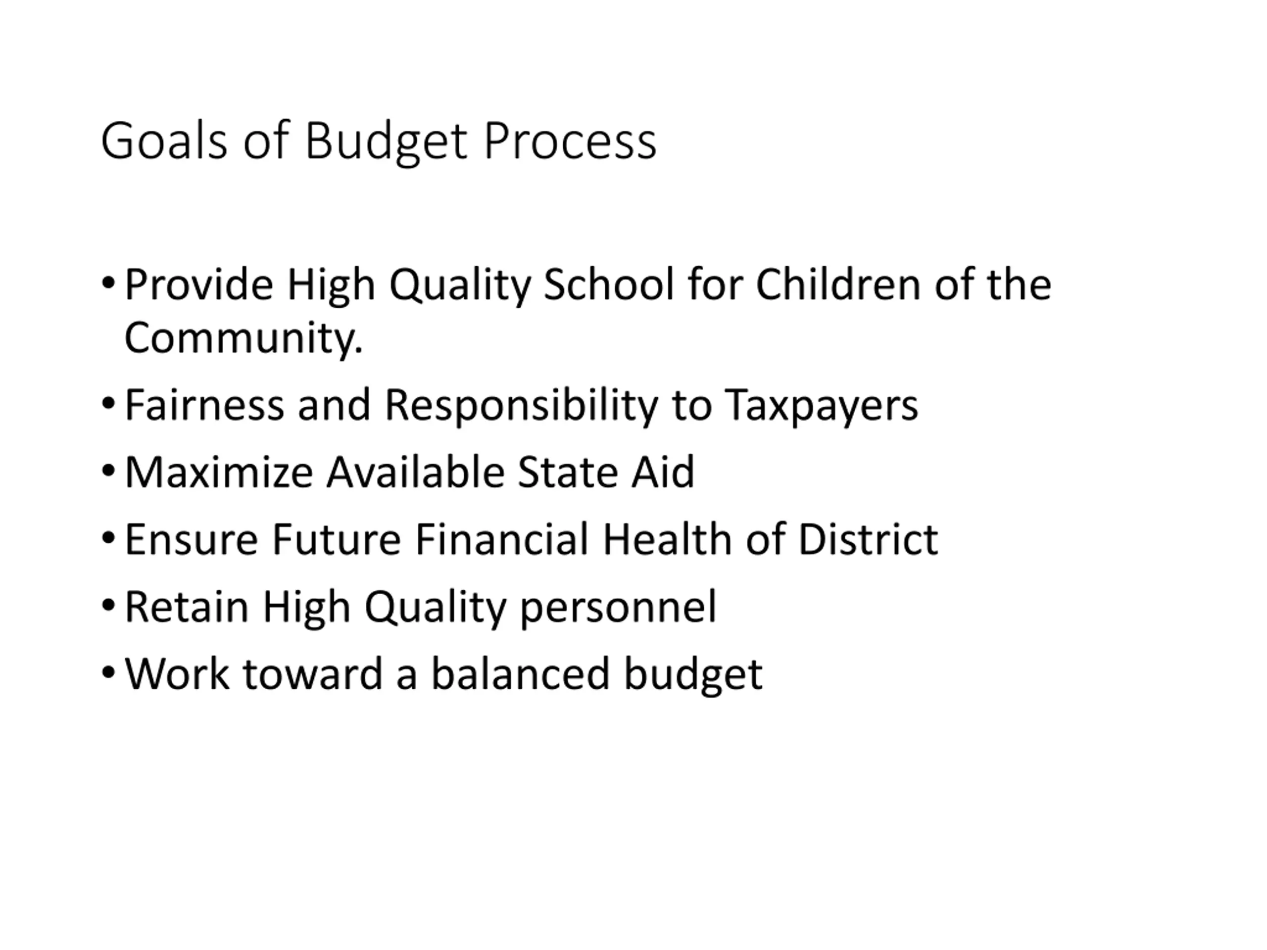 Goals of Budget Process Provide High Quality School for Children of the Community. Fairness and Responsibility to Taxpayers Maximize Available State Aid Ensure Future Financial Health of District Retain High Quality personnel Work toward a balanced budget