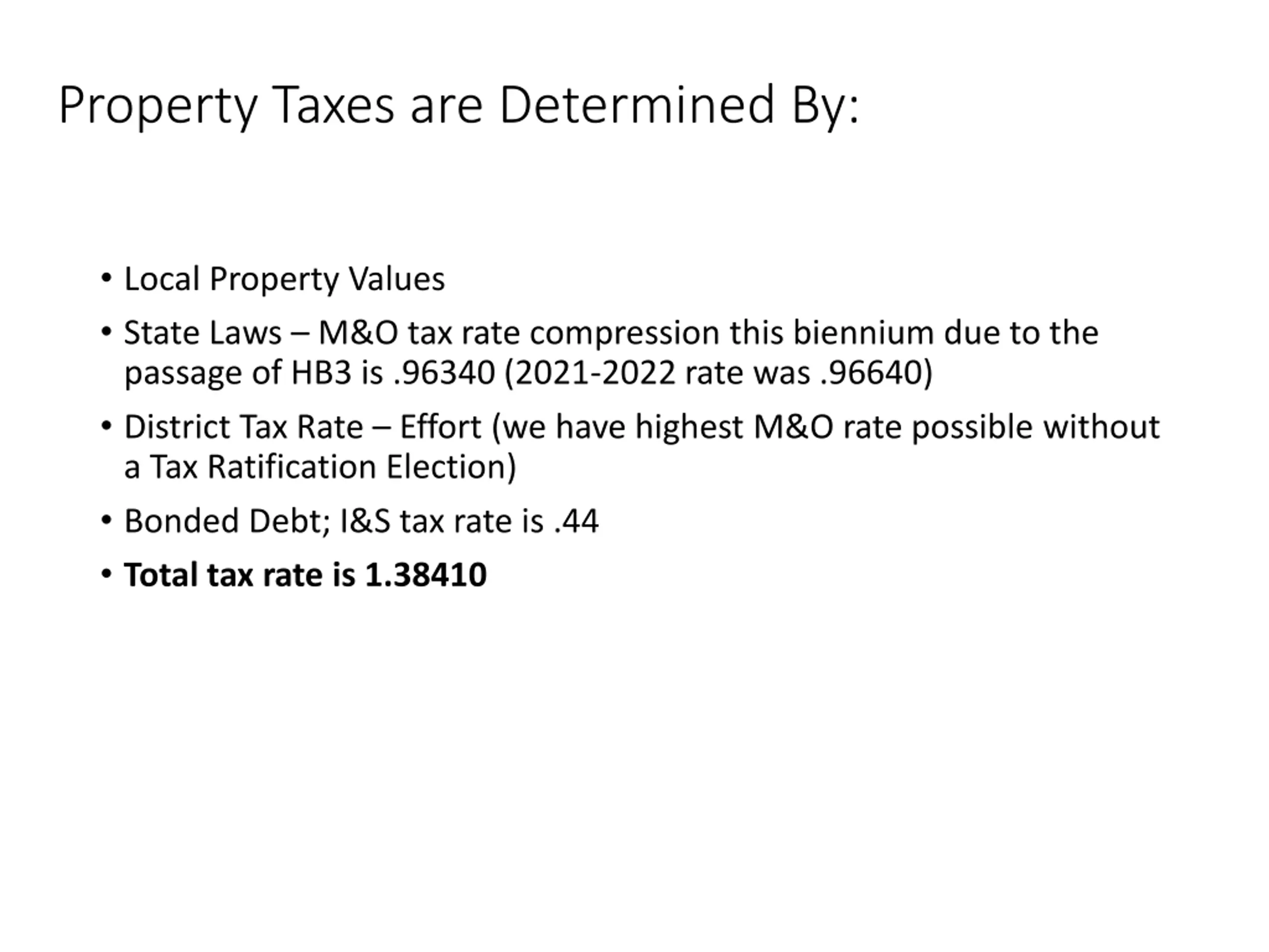 Property Taxes are Determined By: Local Property Values State Laws M&O tax rate compression this biennium due to the passage of HB3 is .96340 (2021-2022 rate was .96640) District Tax Rate Effort (we have highest M&O rate possible without a Tax Ratification Election) Bonded Debt; I&S tax rate is .44 Total tax rate is 1.38410