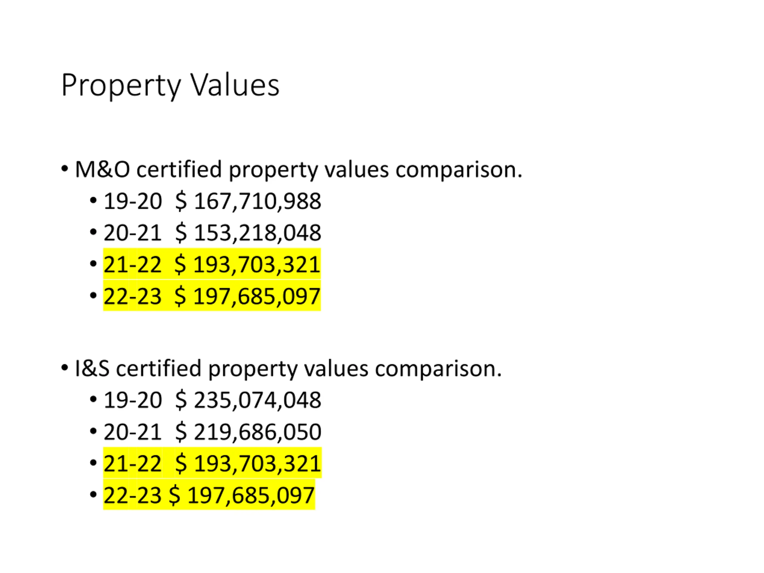 Property Values M&O certified property values comparison. 19-20 $ 167,710,988 20-21 $ 153,218,048 21-22 $ 193,703,321 22-23 $ 197,685,097 I&S certified property values comparison. 19-20 $ 235,074,048 20-21 $ 219,686,050 21-22 $ 193,703,321 22-23 $ 197,685,097