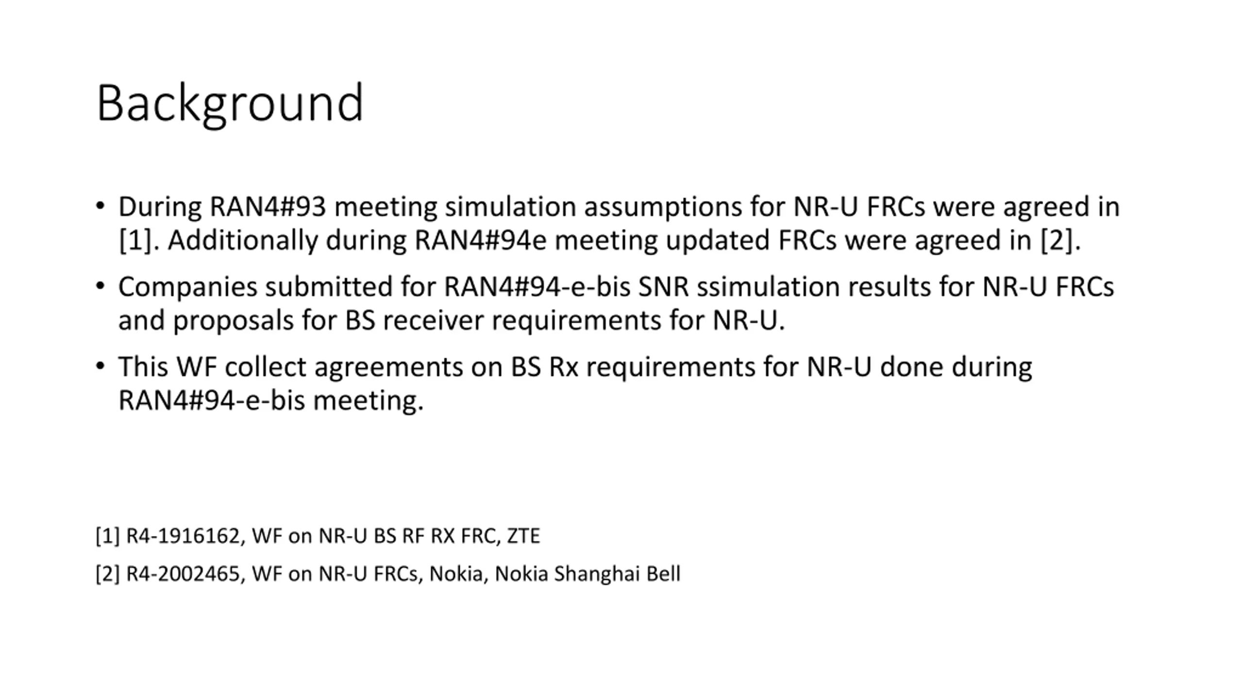Background During RAN4#93 meeting simulation assumptions for NR-U FRCs were agreed in [1]. Additionally during RAN4#94e meeting updated FRCs were agreed in [2]. Companies submitted for RAN4#94-e-bis SNR ssimulation results for NR-U FRCs and proposals for BS receiver requirements for NR-U. This WF collect agreements on BS Rx requirements for NR-U done during RAN4#94-e-bis meeting. [1] R4-1916162, WF on NR-U BS RF RX FRC, ZTE [2] R4-2002465, WF on NR-U FRCs, Nokia, Nokia Shanghai Bell