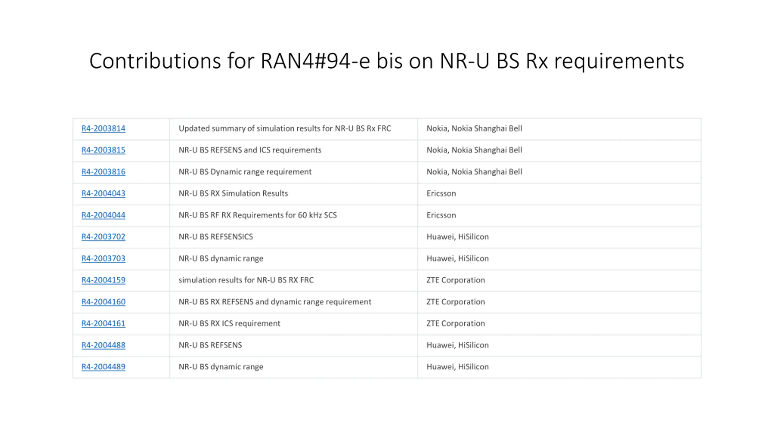 Contributions for RAN4#94-e bis on NR-U BS Rx requirements R4-2003814 Updated summary of simulation results for NR-U BS Rx FRC Nokia, Nokia Shanghai Bell R4-2003815 NR-U BS REFSENS and ICS requirements Nokia, Nokia Shanghai Bell R4-2003816 NR-U BS Dynamic range requirement Nokia, Nokia Shanghai Bell R4-2004043 NR-U BS RX Simulation Results Ericsson R4-2004044 NR-U BS RF RX Requirements for 60 kHz SCS Ericsson R4-2003702 NR-U BS REFSENSICS Huawei, HiSilicon R4-2003703 NR-U BS dynamic range Huawei, HiSilicon R4-2004159 simulation results for NR-U BS RX FRC ZTE Corporation R4-2004160 NR-U BS RX REFSENS and dynamic range requirement ZTE Corporation R4-2004161 NR-U BS RX ICS requirement ZTE Corporation R4-2004488 NR-U BS REFSENS Huawei, HiSilicon R4-2004489 NR-U BS dynamic range Huawei, HiSilicon