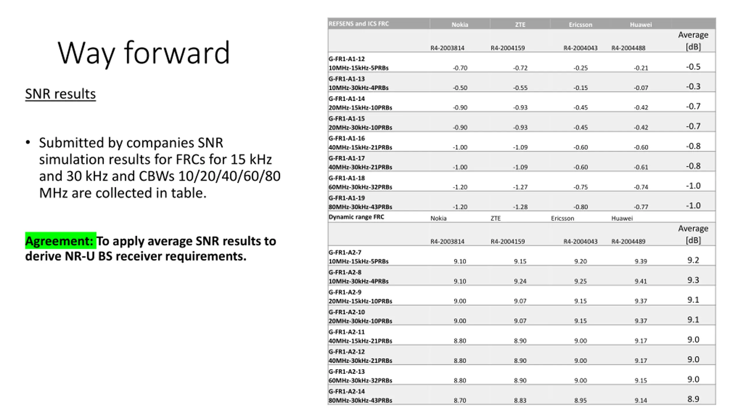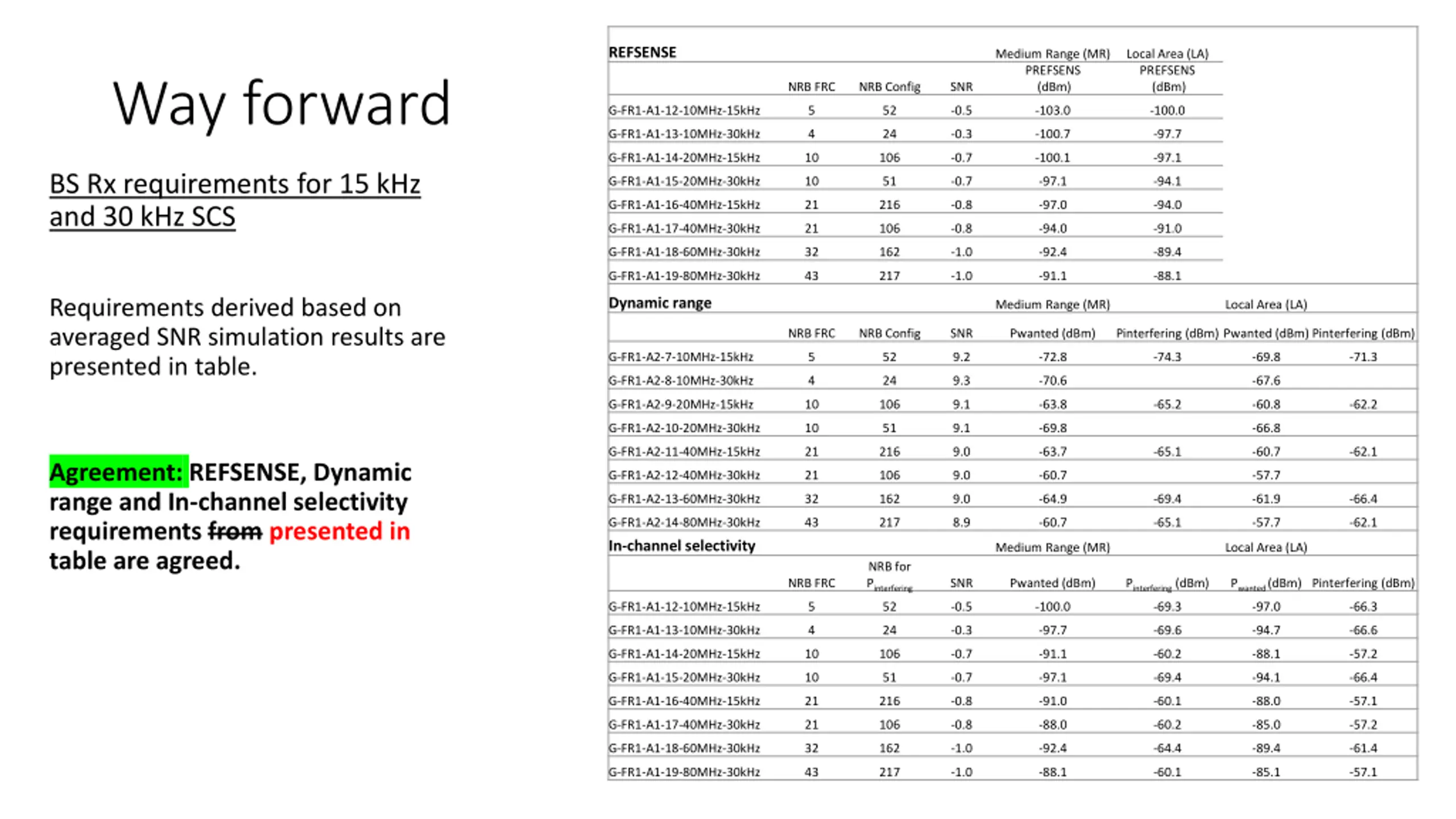 REFSENSE Medium Range (MR) PREFSENS (dBm) Local Area (LA) PREFSENS (dBm) Way forward NRB FRC NRB Config SNR G-FR1-A1-12-10MHz-15kHz 5 52 -0.5 -103.0 -100.0 G-FR1-A1-13-10MHz-30kHz 4 24 -0.3 -100.7 -97.7 G-FR1-A1-14-20MHz-15kHz 10 106 -0.7 -100.1 -97.1 BS Rx requirements for 15 kHz and 30 kHz SCS G-FR1-A1-15-20MHz-30kHz 10 51 -0.7 -97.1 -94.1 G-FR1-A1-16-40MHz-15kHz 21 216 -0.8 -97.0 -94.0 G-FR1-A1-17-40MHz-30kHz 21 106 -0.8 -94.0 -91.0 G-FR1-A1-18-60MHz-30kHz 32 162 -1.0 -92.4 -89.4 G-FR1-A1-19-80MHz-30kHz 43 217 -1.0 -91.1 -88.1 Requirements derived based on averaged SNR simulation results are presented in table. Dynamic range Medium Range (MR) Local Area (LA) NRB FRC NRB Config SNR Pwanted (dBm) Pinterfering (dBm) Pwanted (dBm) Pinterfering (dBm) G-FR1-A2-7-10MHz-15kHz 5 52 9.2 -72.8 -74.3 -69.8 -71.3 G-FR1-A2-8-10MHz-30kHz 4 24 9.3 -70.6 -67.6 G-FR1-A2-9-20MHz-15kHz 10 106 9.1 -63.8 -65.2 -60.8 -62.2 G-FR1-A2-10-20MHz-30kHz 10 51 9.1 -69.8 -66.8 G-FR1-A2-11-40MHz-15kHz 21 216 9.0 -63.7 -65.1 -60.7 -62.1 Agreement: REFSENSE, Dynamic range and In-channel selectivity requirements from presented in table are agreed. G-FR1-A2-12-40MHz-30kHz 21 106 9.0 -60.7 -57.7 G-FR1-A2-13-60MHz-30kHz 32 162 9.0 -64.9 -69.4 -61.9 -66.4 G-FR1-A2-14-80MHz-30kHz In-channel selectivity 43 217 8.9 -60.7 -65.1 -57.7 -62.1 Medium Range (MR) Local Area (LA) NRB for Pinterfering NRB FRC SNR Pwanted (dBm) Pinterfering(dBm) Pwanted (dBm) Pinterfering (dBm) G-FR1-A1-12-10MHz-15kHz 5 52 -0.5 -100.0 -69.3 -97.0 -66.3 G-FR1-A1-13-10MHz-30kHz 4 24 -0.3 -97.7 -69.6 -94.7 -66.6 G-FR1-A1-14-20MHz-15kHz 10 106 -0.7 -91.1 -60.2 -88.1 -57.2 G-FR1-A1-15-20MHz-30kHz 10 51 -0.7 -97.1 -69.4 -94.1 -66.4 G-FR1-A1-16-40MHz-15kHz 21 216 -0.8 -91.0 -60.1 -88.0 -57.1 G-FR1-A1-17-40MHz-30kHz 21 106 -0.8 -88.0 -60.2 -85.0 -57.2 G-FR1-A1-18-60MHz-30kHz 32 162 -1.0 -92.4 -64.4 -89.4 -61.4 G-FR1-A1-19-80MHz-30kHz 43 217 -1.0 -88.1 -60.1 -85.1 -57.1
