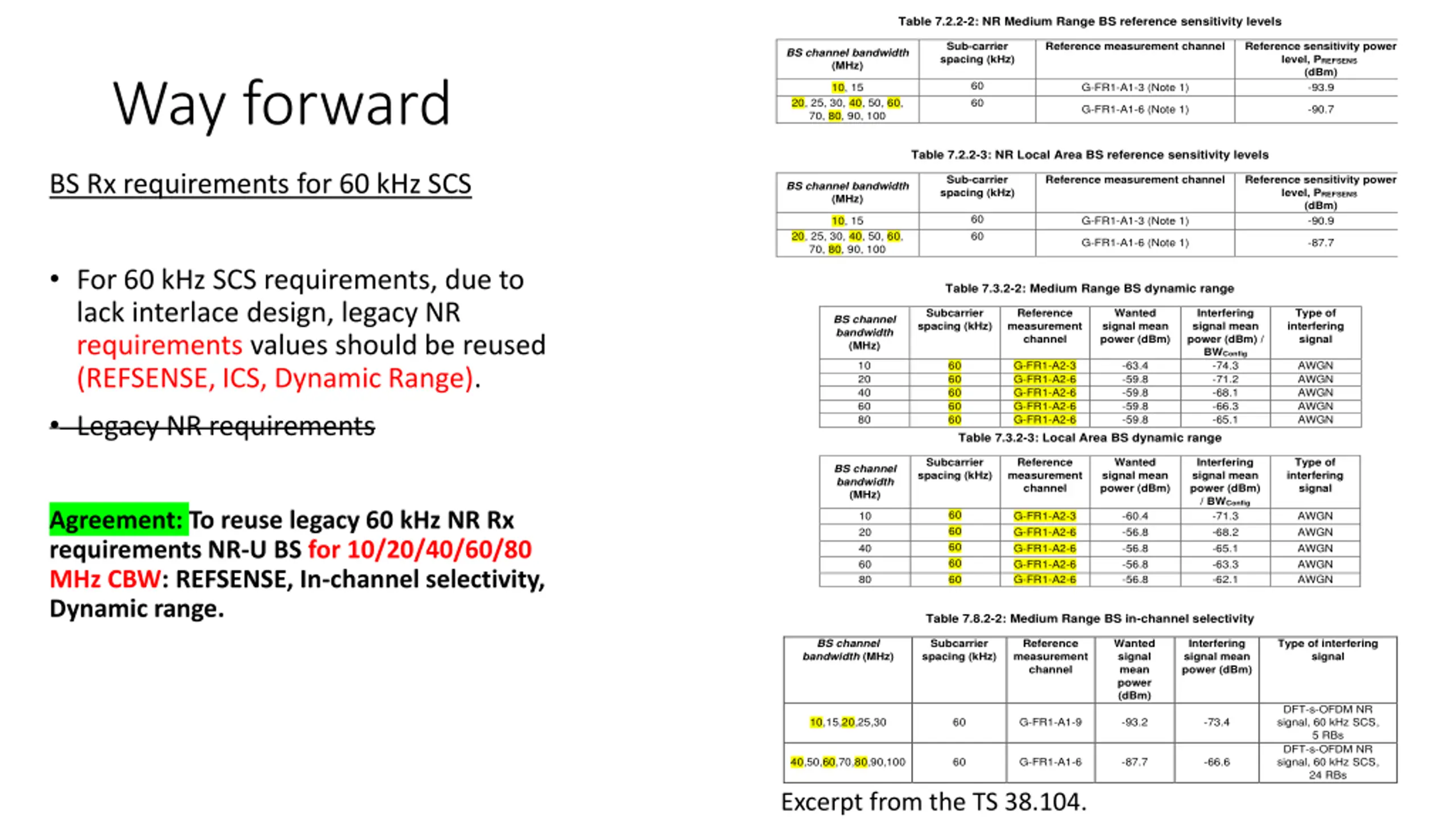 Table 7.2.2-2: NR Medium Range BS reference sensitivity levels Sub-carrier spacing (kHz) Reference measurement channel Reference sensitivity power level, PREFSENS (dBm) -93.9 BS channel bandwidth (MHz) Way forward 60 60 10, 15 G-FR1-A1-3 (Note 1) 20, 25, 30, 40, 50, 60, 70, 80, 90, 100 G-FR1-A1-6 (Note 1) -90.7 Table 7.2.2-3: NR Local Area BS reference sensitivity levels BS Rx requirements for 60 kHz SCS Sub-carrier spacing (kHz) Reference measurement channel Reference sensitivity power level, PREFSENS (dBm) -90.9 BS channel bandwidth (MHz) 60 60 10, 15 G-FR1-A1-3 (Note 1) 20, 25, 30, 40, 50, 60, 70, 80, 90, 100 G-FR1-A1-6 (Note 1) -87.7 For 60 kHz SCS requirements, due to lack interlace design, legacy NR requirements values should be reused (REFSENSE, ICS, Dynamic Range). Legacy NR requirements Table 7.3.2-2: Medium Range BS dynamic range Subcarrier spacing (kHz) Reference measurement channel Wanted signal mean power (dBm) Interfering signal mean power (dBm) / BWConfig -74.3 -71.2 -68.1 -66.3 -65.1 Type of interfering signal BS channel bandwidth (MHz) 10 20 40 60 80 60 60 60 60 60 G-FR1-A2-3 G-FR1-A2-6 G-FR1-A2-6 G-FR1-A2-6 G-FR1-A2-6 -63.4 -59.8 -59.8 -59.8 -59.8 AWGN AWGN AWGN AWGN AWGN Table 7.3.2-3: Local Area BS dynamic range Subcarrier spacing (kHz) Reference measurement channel Wanted signal mean power (dBm) Interfering signal mean power (dBm) / BWConfig -71.3 -68.2 -65.1 -63.3 -62.1 Type of interfering signal BS channel bandwidth (MHz) Agreement: To reuse legacy 60 kHz NR Rx requirements NR-U BS for 10/20/40/60/80 MHz CBW: REFSENSE, In-channel selectivity, Dynamic range. 60 60 60 60 60 10 20 40 60 80 G-FR1-A2-3 G-FR1-A2-6 G-FR1-A2-6 G-FR1-A2-6 G-FR1-A2-6 -60.4 -56.8 -56.8 -56.8 -56.8 AWGN AWGN AWGN AWGN AWGN Table 7.8.2-2: Medium Range BS in-channel selectivity BS channel bandwidth (MHz) Subcarrier spacing (kHz) Reference measurement channel Wanted signal mean power (dBm) Interfering signal mean power (dBm) Type of interfering signal DFT-s-OFDM NR signal, 60 kHz SCS, 5 RBs DFT-s-OFDM NR signal, 60 kHz SCS, 24 RBs 10,15,20,25,30 60 G-FR1-A1-9 -93.2 -73.4 40,50,60,70,80,90,100 60 G-FR1-A1-6 -87.7 -66.6 Excerpt from the TS 38.104.